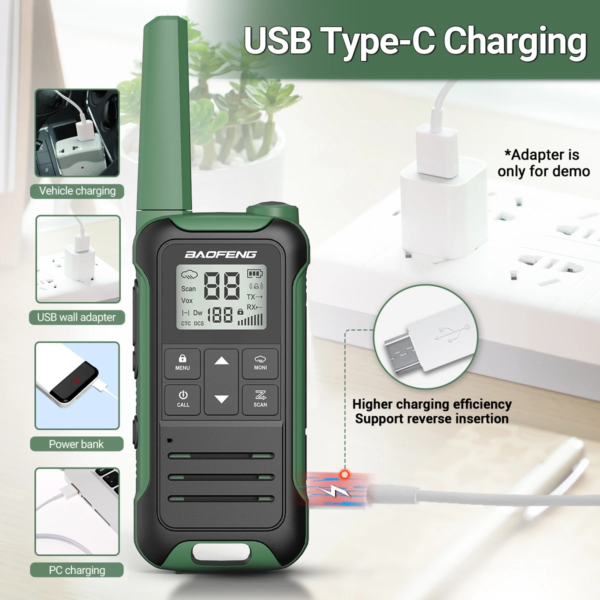 * Cómo comunicarse con diferentes walkie talkies: la frecuencia de walkie talkie es fija, ajustar al mismo canal puede comunicarse. No es necesario programar frecuencias usando cables.
