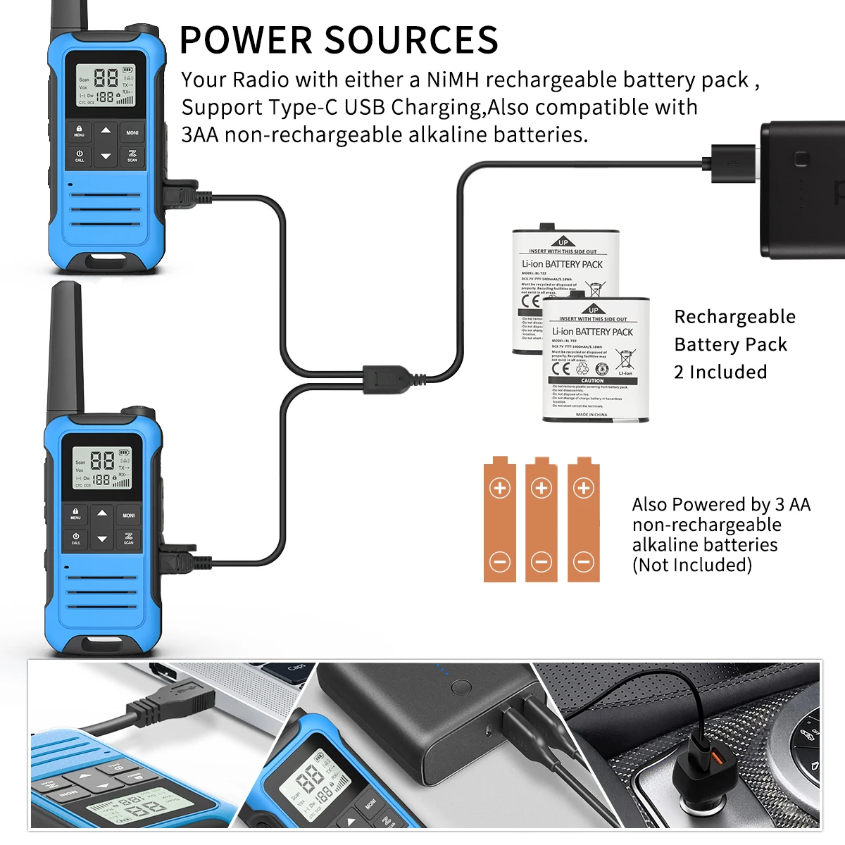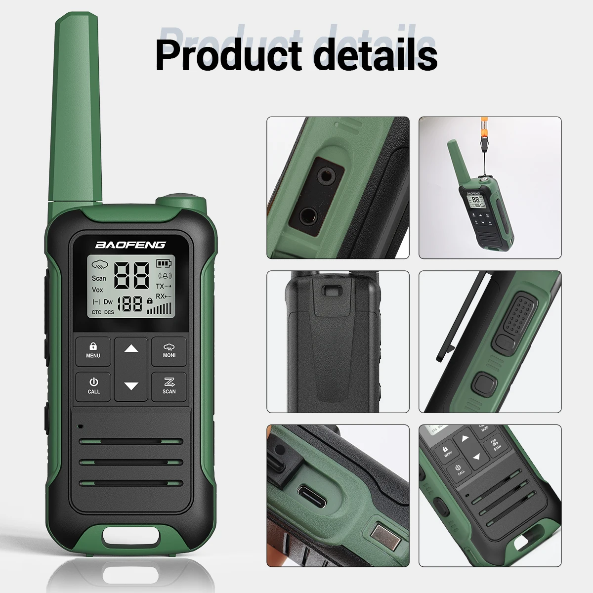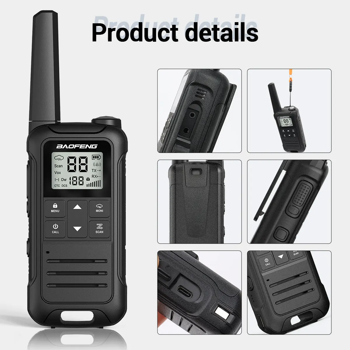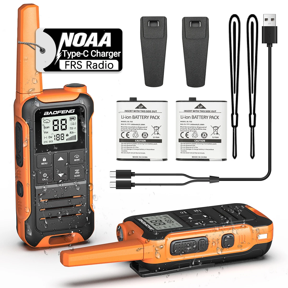 👍El paquete contiene (walkie talkie, batería de iones de litio, clip para el cinturón, correa de mano) X 2 Y (cable de carga 2 en 1 tipo C, manual del usuario) X1.