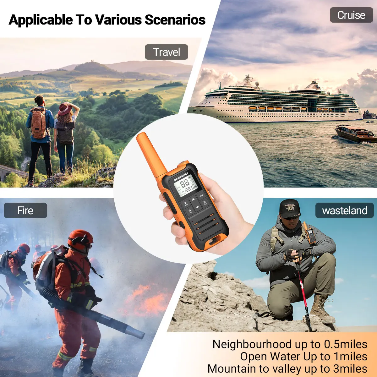 * Comunicación de largo alcance: Los walkie talkies de largo alcance pueden alcanzar 3 millas en áreas abiertas como áreas rurales, suburbios o Playa, etc. donde no hay refugio. Si se encuentra en ciudades o pueblos, los walkie talkies pueden alcanzar 0.7-1.2 millas en la mayoría de los casos. La distancia real depende de la obstrucción del entorno actual.