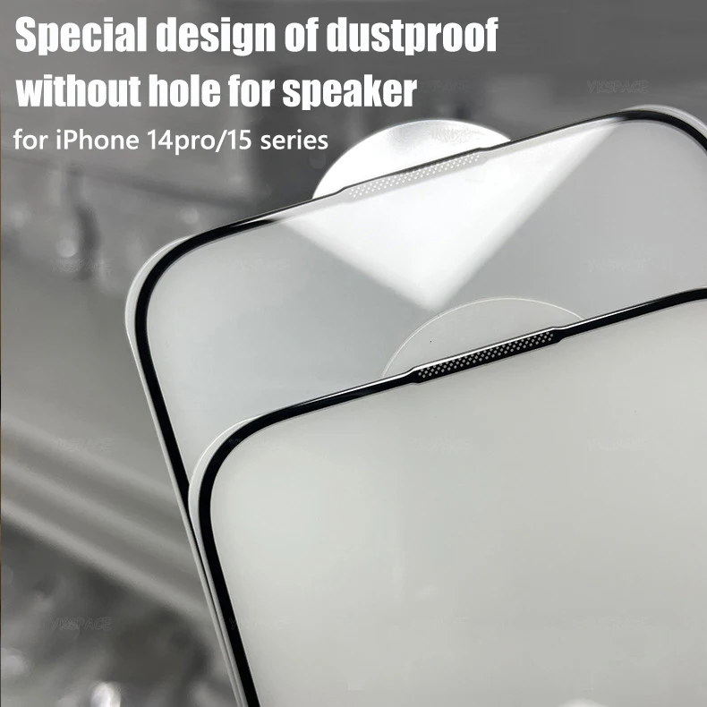 Atención por favor:Este producto para iPhone Serie 14/15/16 con diseño especial a prueba de polvo.Eso essin agujeroPara el altavoz, el canal de sonido ubicado en elatrásdel vidrio templado.