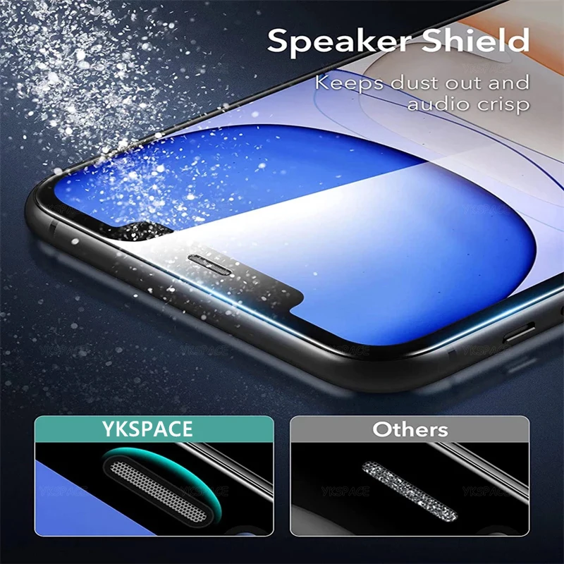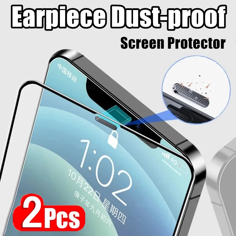 2 uds rejilla a prueba de polvo 9H vidrio templado para iPhone 16 15 14 Plus 13 12 mini 11 Pro Max X Xs XR Protector de pantalla de filtro de red de polvo