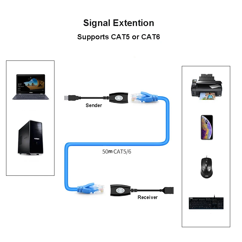 3.Conecte dispositivos USB1.1\ USB2.0\USB3.0 como mouse/teclado/impresora/teléfono, extienda hasta 50 metros y 100 metros para dispositivos USB de baja velocidad