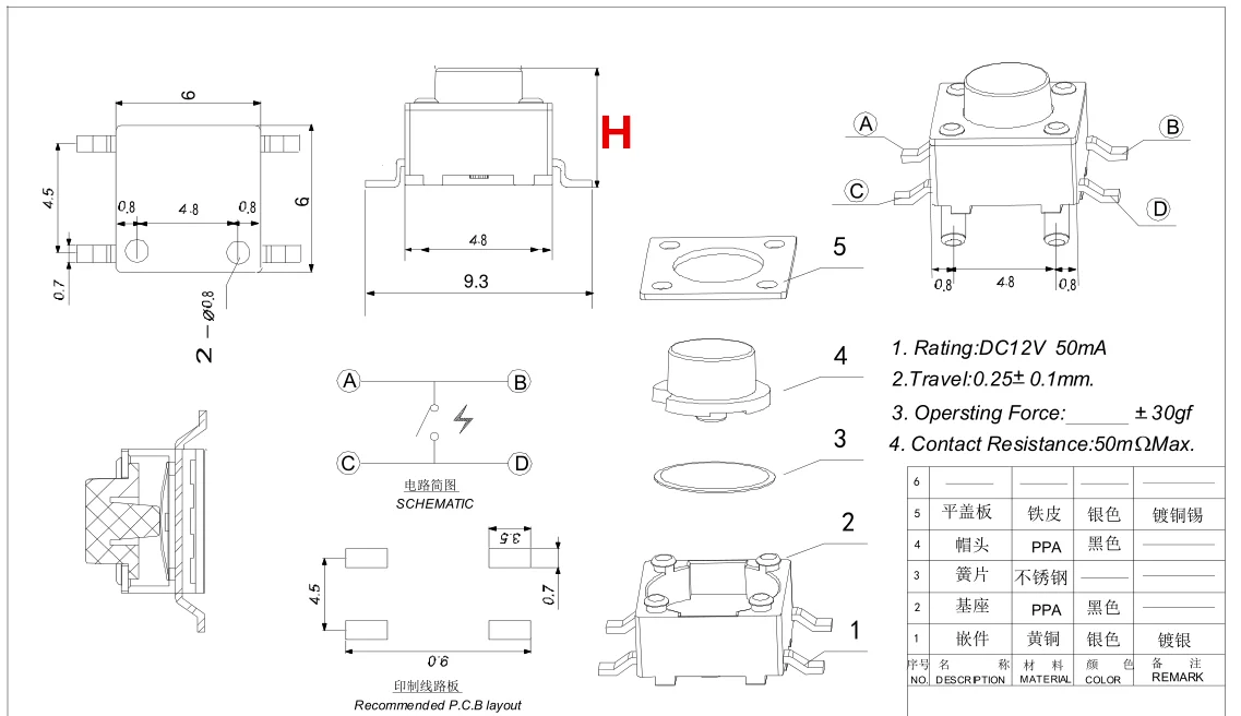 Comprar 20 piezas SMD de 6x6x14mm, pulsador táctil de 4 pines, microinterruptor de reinicio automático, 6x6x14