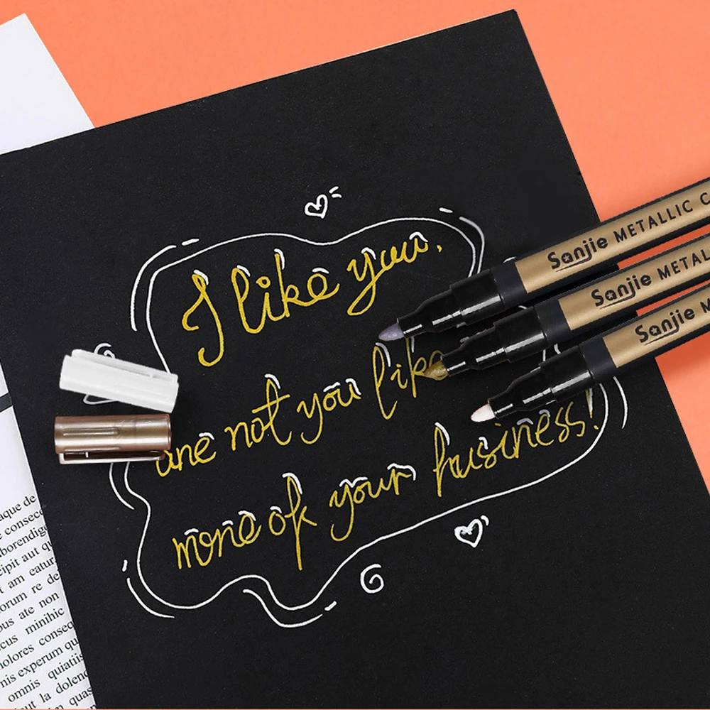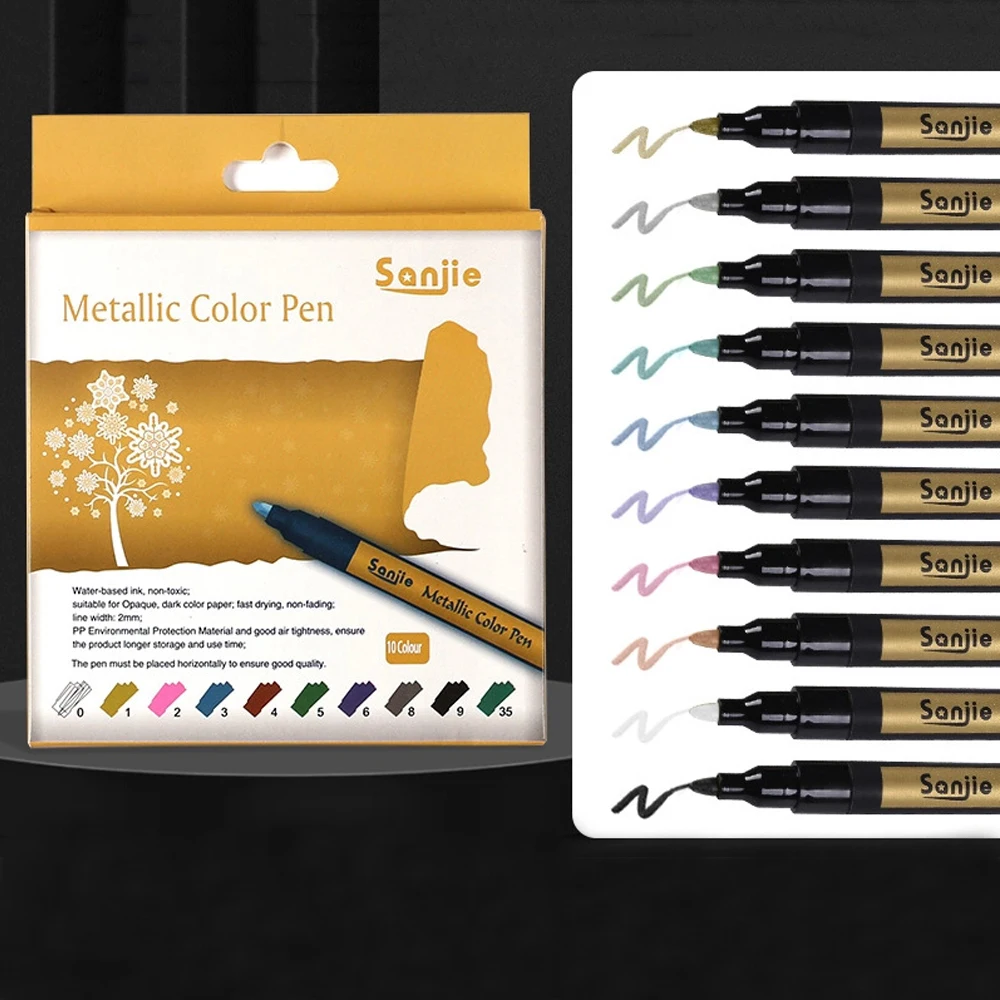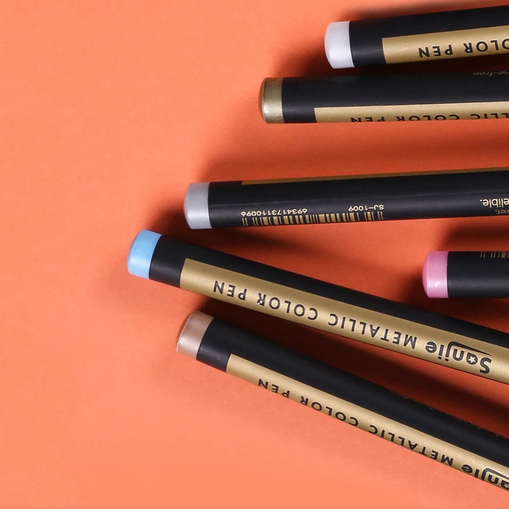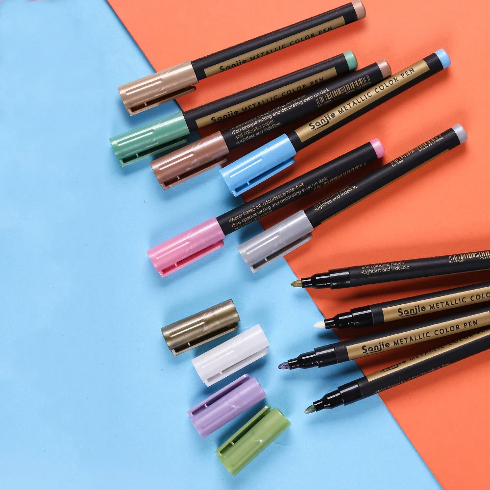 Los marcadores metálicos ofrecen marcas metálicas puras y de secado rápido que resisten la decoloración y el agua.Es más, no es necesario agitar antes de marcar.