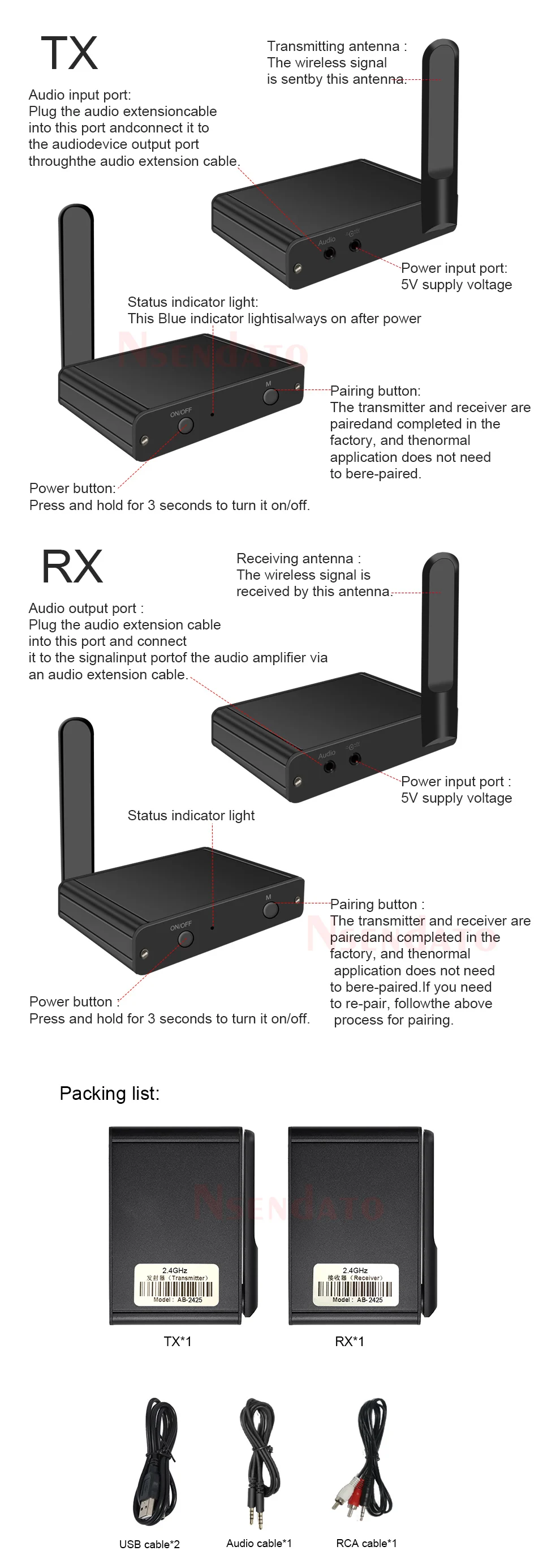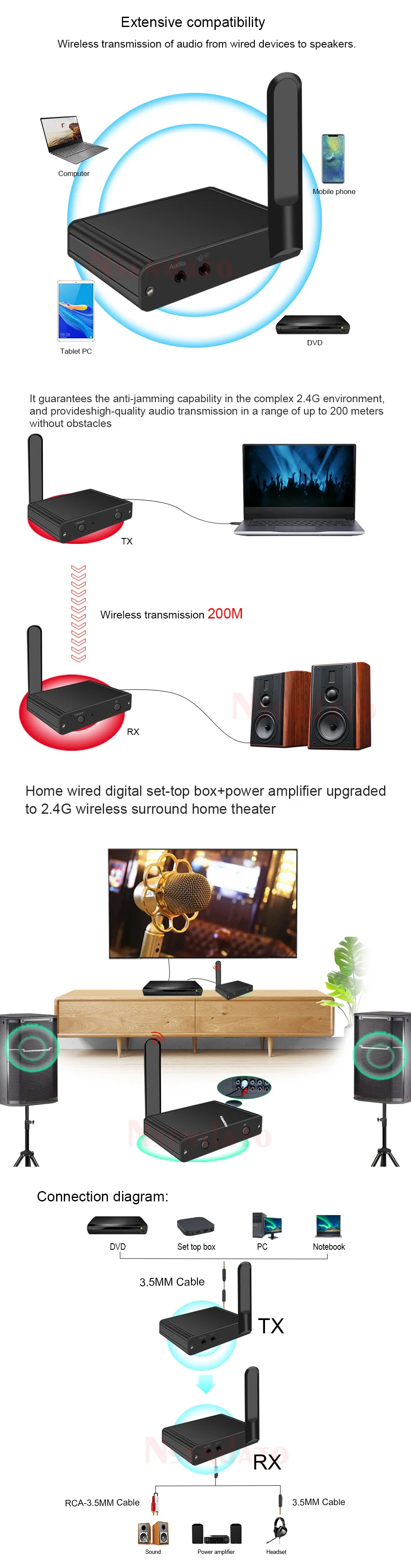 200M 2,4G Hifi música Digital sonido transmisor de Audio inalámbrico adaptador receptor 3,5mm Cable de Audio RCA para PC teléfono iPad Ipod DVD