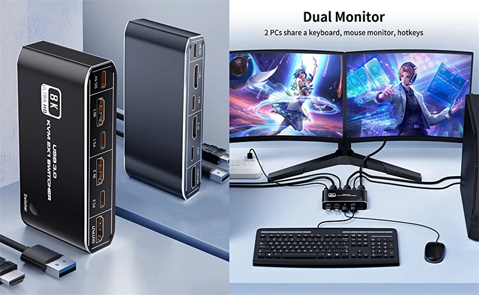 Caja de conmutador KVM HDMI USB 3,0 8K 2 en 1 salida para 2 PC, teclado, ratón, impresora, enchufe, pantalla de vídeo Paly, divisor Swltch USB
