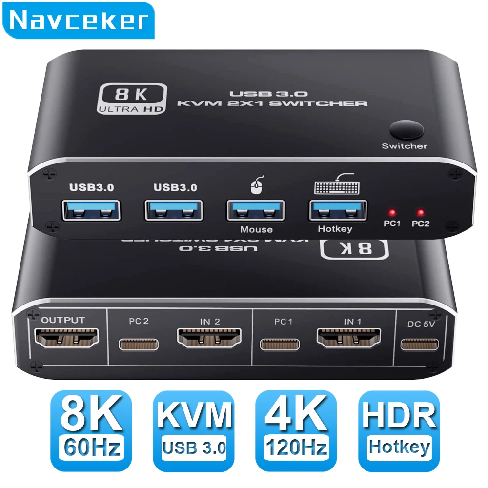 ZY-AK4, el conmutador KVM USB HDMI 8K Navceker le permite compartir un teclado USB, un mouse USB, un dispositivo USB 3.0 y un monitor HDMI para controlar 2 computadoras, portátiles y consolas de juegos.