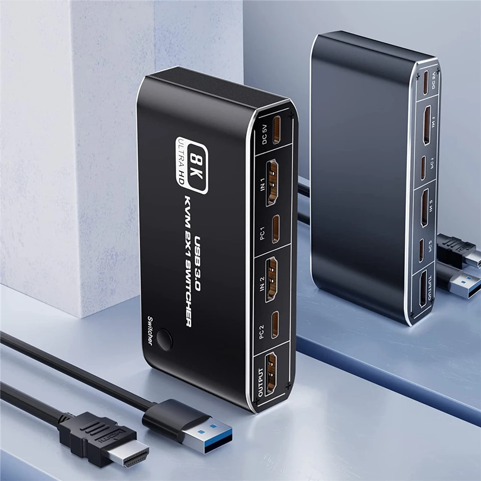 Caja de conmutador KVM HDMI USB 3,0 8K 2 en 1 salida para 2 PC, teclado, ratón, impresora, enchufe, pantalla de vídeo Paly, divisor Swltch USB