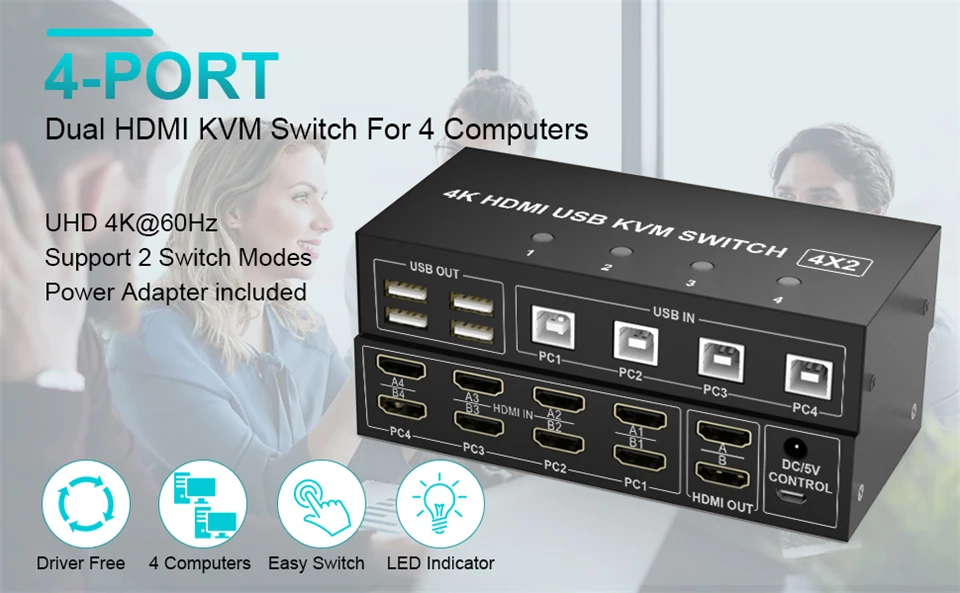 El conmutador KVM Navceker 4K 60Hz 4x2 HDMI USB le permite compartir un teclado USB, un ratón USB y dos monitores HDMI para controlar 4 ordenadores, portátiles y consolas de juegos.