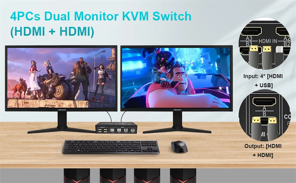 Este conmutador KVM de doble monitor HDMI de 4 puertos le ayuda a controlar 4 monitores compartidos de 2 (modo de visualización extendido o modo de visualización de copia) con un solo juego de teclado y ratón USB.