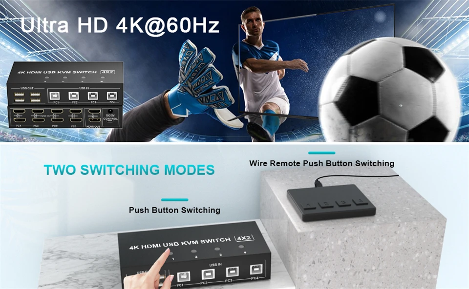 El conmutador KVM de doble monitor HDMI de 4 puertos con resolución máxima de hasta 4K @ 60Hz, compatible 3840x2160 @ 30Hz, 1080P, 1080P 3D, 1080I, 720P, 576P, 576I, 480P, 480I.