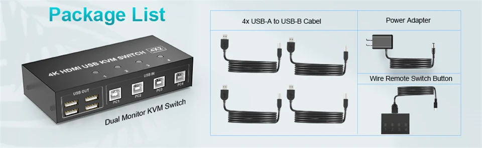 ✅【Paquete y garantía】 1x conmutador KVM de doble monitor HDMI, 4x cables USB, 1x cable de alimentación USB, 1x interruptor de botón con cable, 1x manual de usuario;