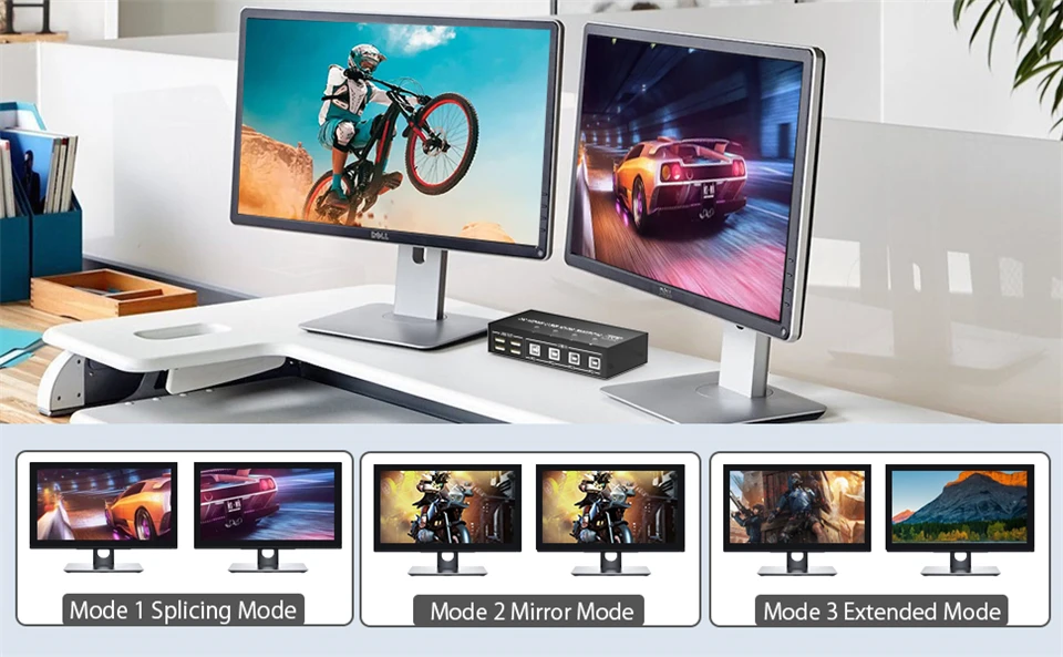 ✅【Conmutador KVM de doble monitor de 3 modos】 Conmutador KVM de doble monitor HDMI de 4 puertos Con 3 modos de visualización. Modo 1: empalme de dos monitores para mostrar la imagen de un host; Modo 2: dos monitores muestran la pantalla principal y la pantalla extendida de un host; Modo 3: dos monitores reflejan los escritorios de un host. (NOTA: Los 3 modos deben configurarse manualmente en la configuración de pantalla del sistema)
