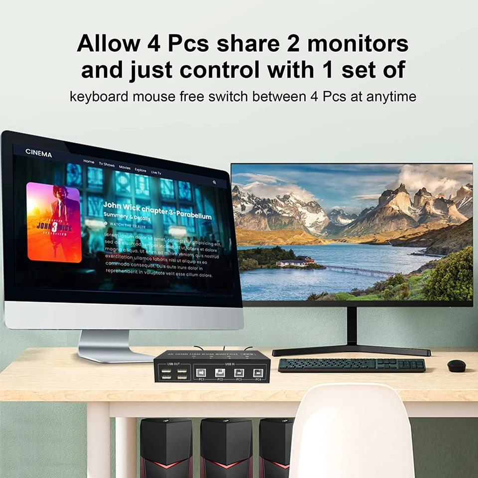 Este conmutador KVM de doble monitor HDMI de 4 puertos le ayuda a controlar 4 monitores compartidos de 2 (modo de visualización extendido o modo de visualización de copia) con un solo juego de teclado y ratón USB.