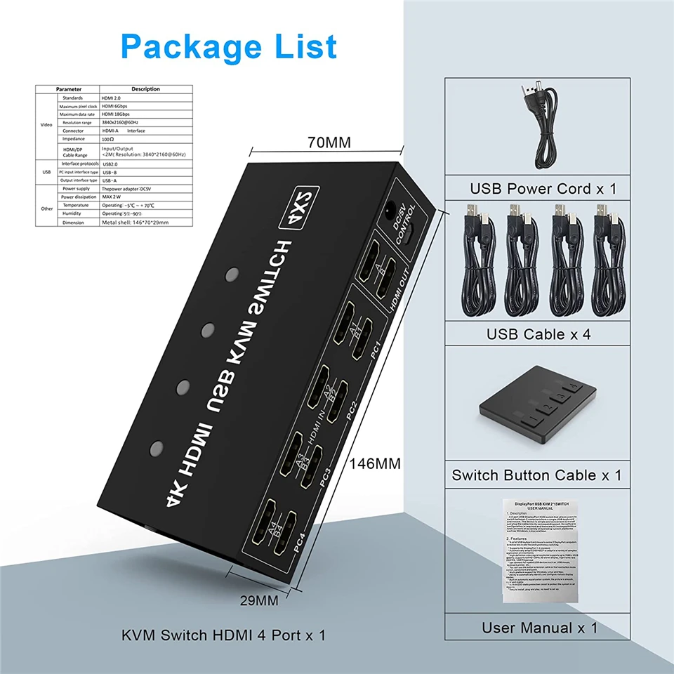 ✅【Paquete y garantía】 1x conmutador KVM de doble monitor HDMI, 4x cables USB, 1x cable de alimentación USB, 1x interruptor de botón con cable, 1x manual de usuario;