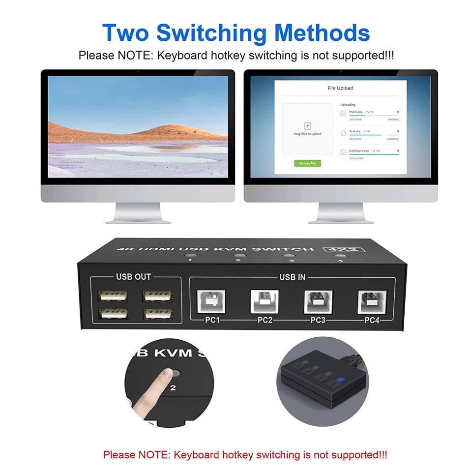 El conmutador KVM Navceker 4K 60Hz 4x2 HDMI USB le permite compartir un teclado USB, un ratón USB y dos monitores HDMI para controlar 4 ordenadores, portátiles y consolas de juegos.