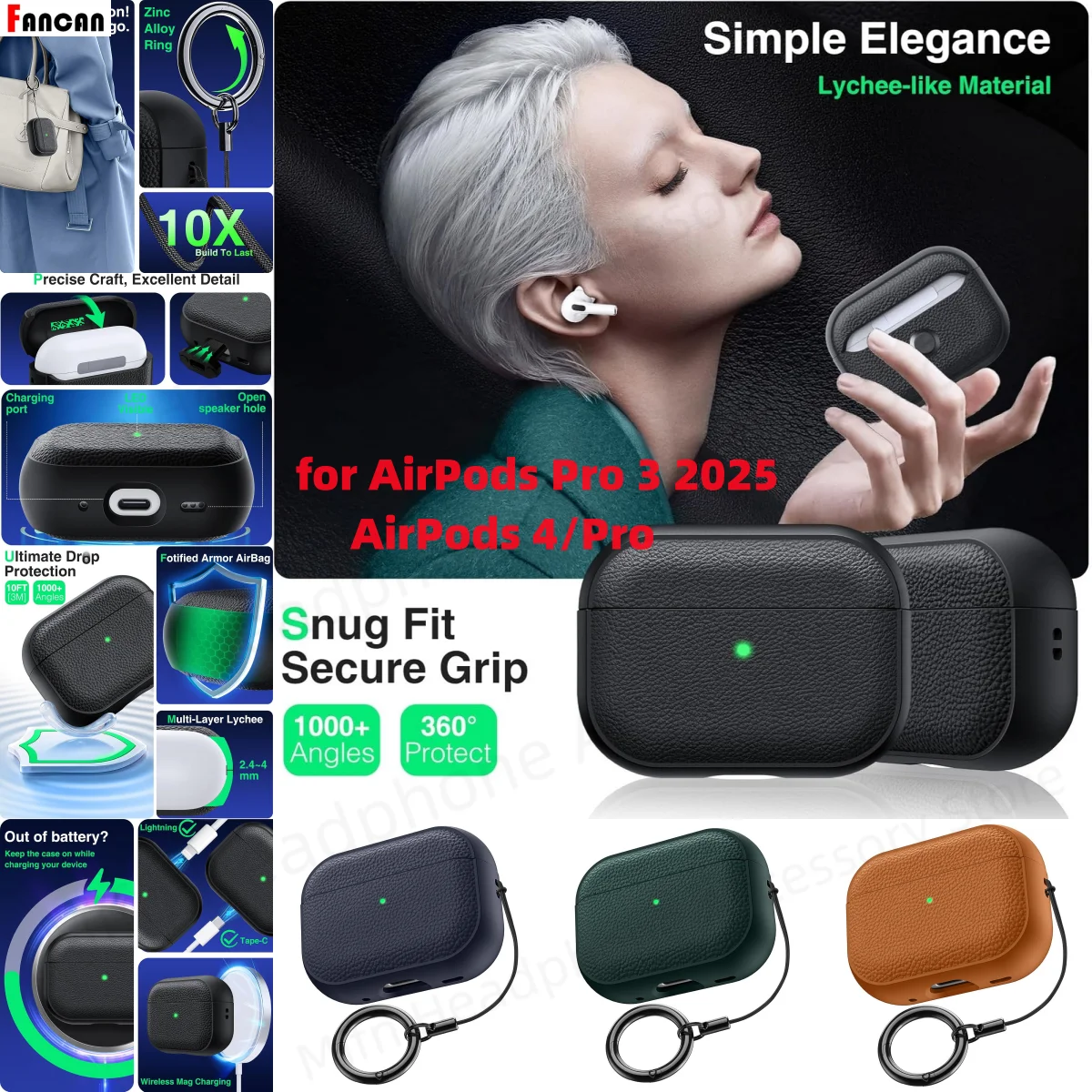 2025 para AirPods Pro 3 funda protectora de diseño de cuero TPU suave con llavero con cordón para AirPods 4 Pro 2 Pro3 fundas