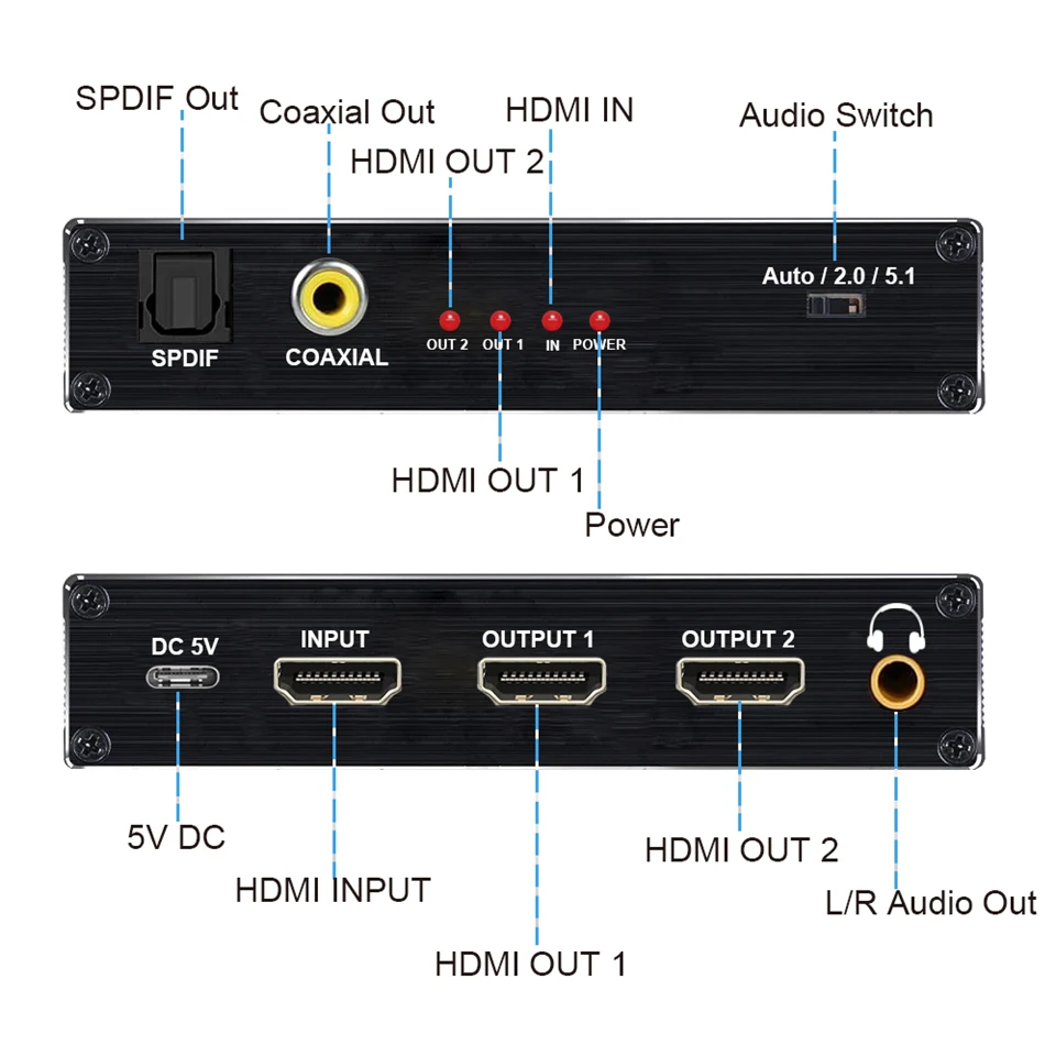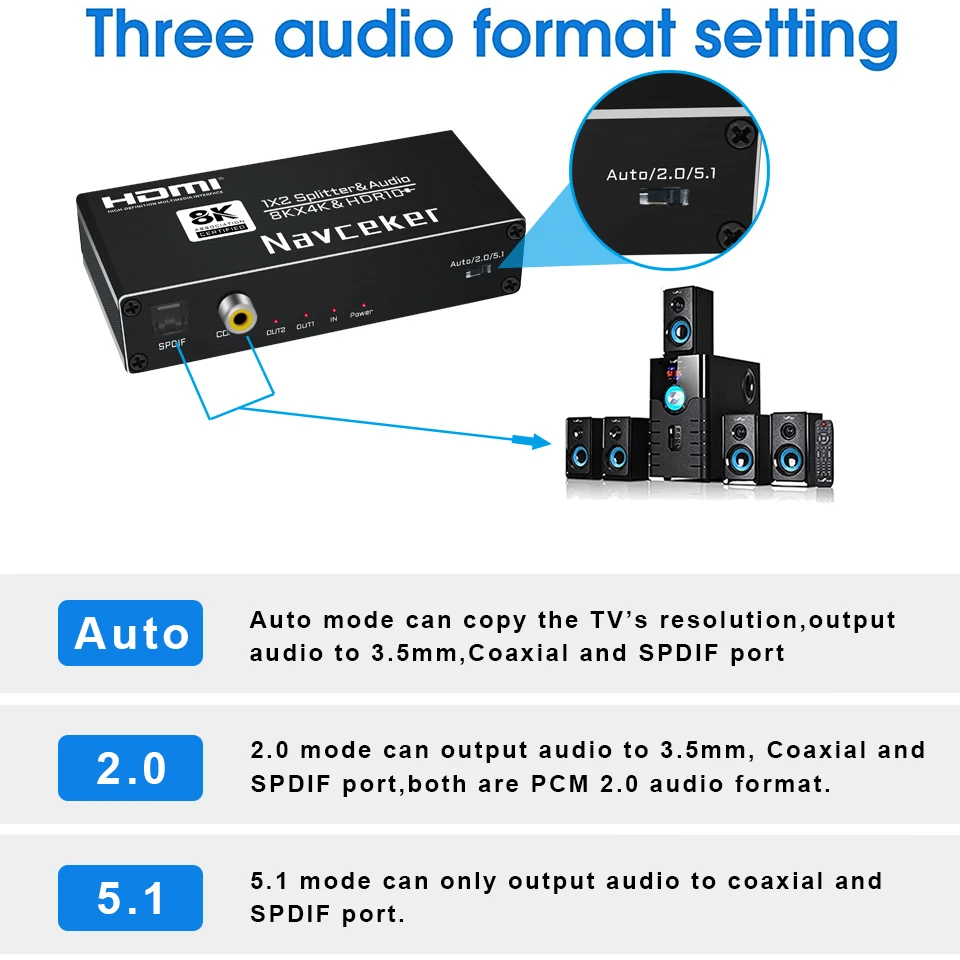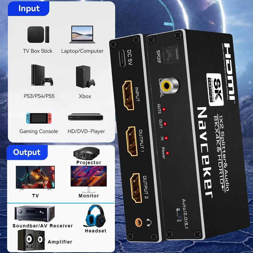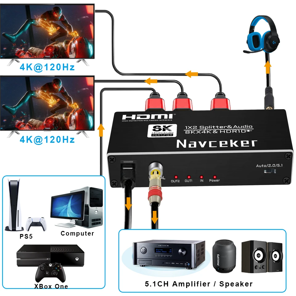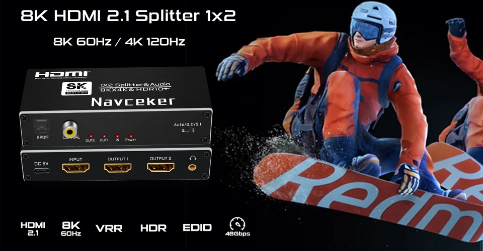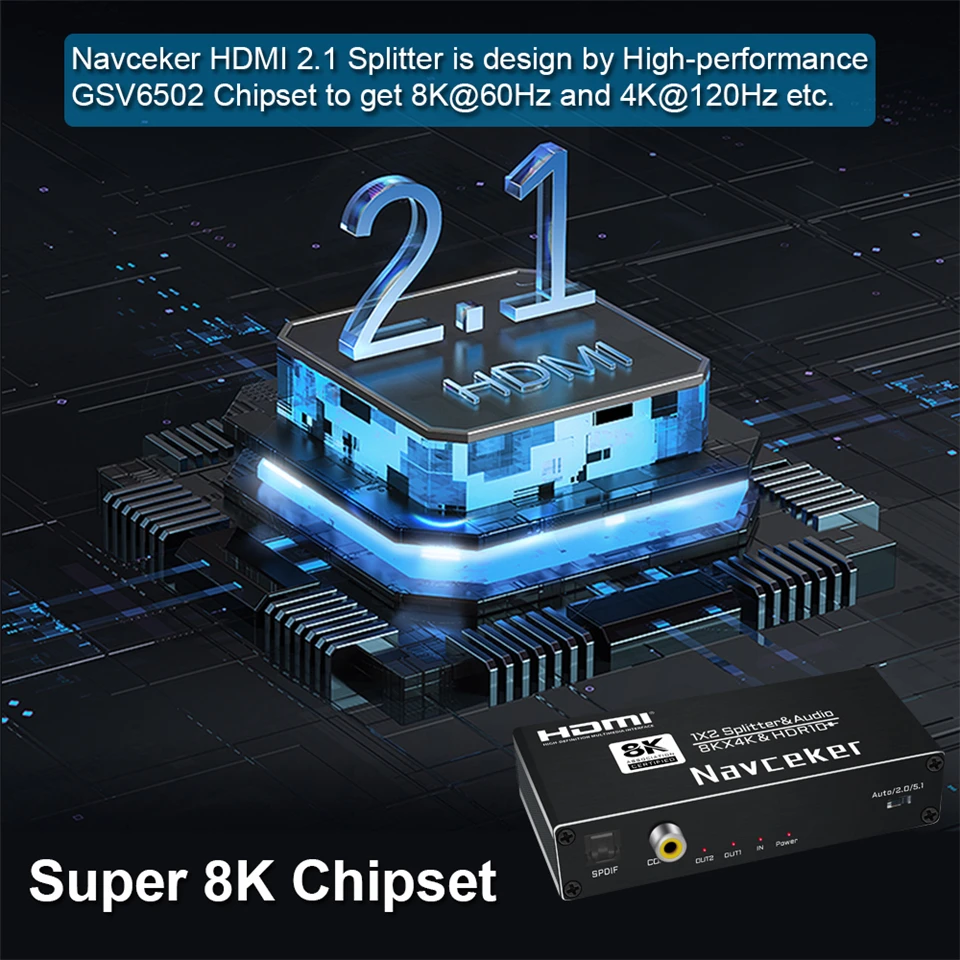 ZY-AV8K, Navceker HDMI 2.1 divisor de 8K a 60hz le permite mostrar UNA fuente HDMI en DOS pantallas y agrega una adicional 3.Conector de 5 mm, SPDIF y puerto de salida de audio coaxial, compatible con RGB 4:4/RGB8:8:8, pantalla súper clara de 8K@60HZ/4K@120Hz, hace que la imagen sea más clara y realista.
