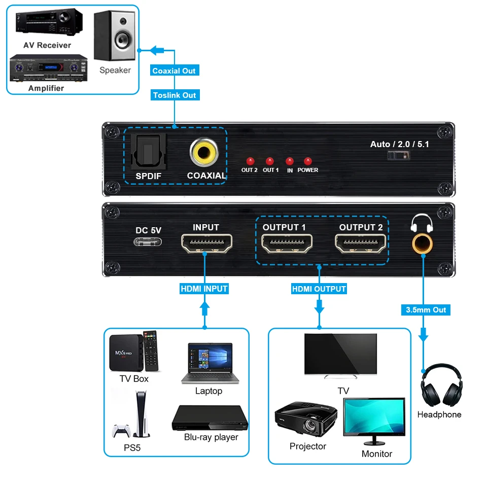 Comprar 2025 El mejor divisor HDMI de 8K 1x2 4K 120Hz 1 en 2 salidas Extractor de audio HDMI a convertidor óptico para computadora portátil Apple TV XBox PS5