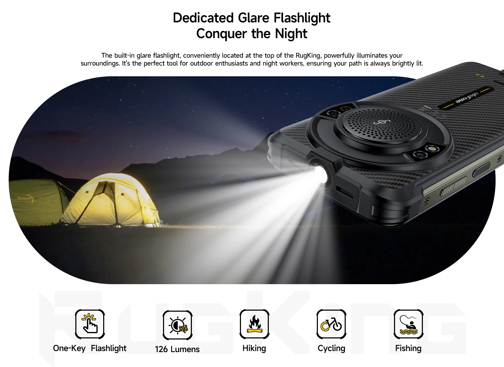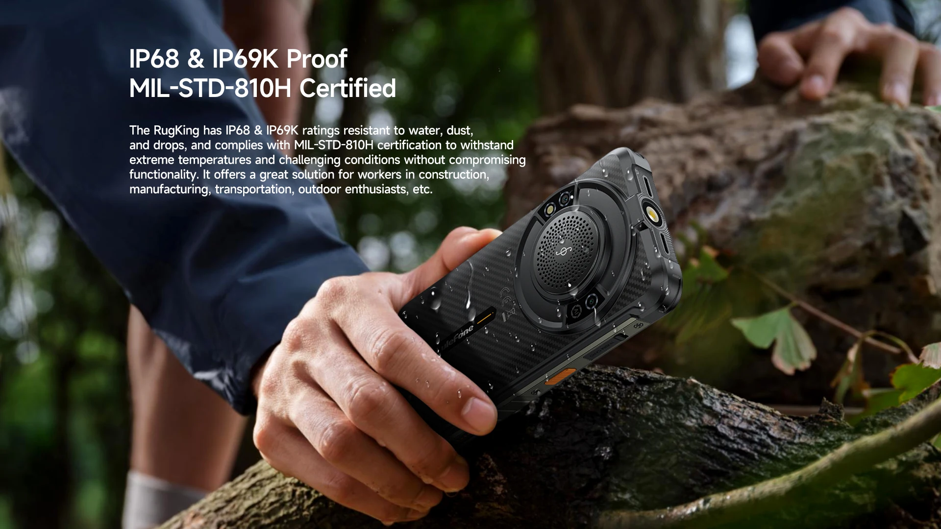 ●RugKing es resistente a salpicaduras, agua y polvo y fue probado en condiciones de laboratorio controladas con una clasificación IP68 según norma IEC 60529 (profundidad máxima de 1.8 metros hasta 30 minutos).El cargador y los accesorios no son resistentes al agua.La resistencia a salpicaduras, agua y polvo no es permanente y puede disminuir debido al desgaste normal.No intente cargar un daño líquido húmedo de RugKing que no esté cubierto por la garantía.