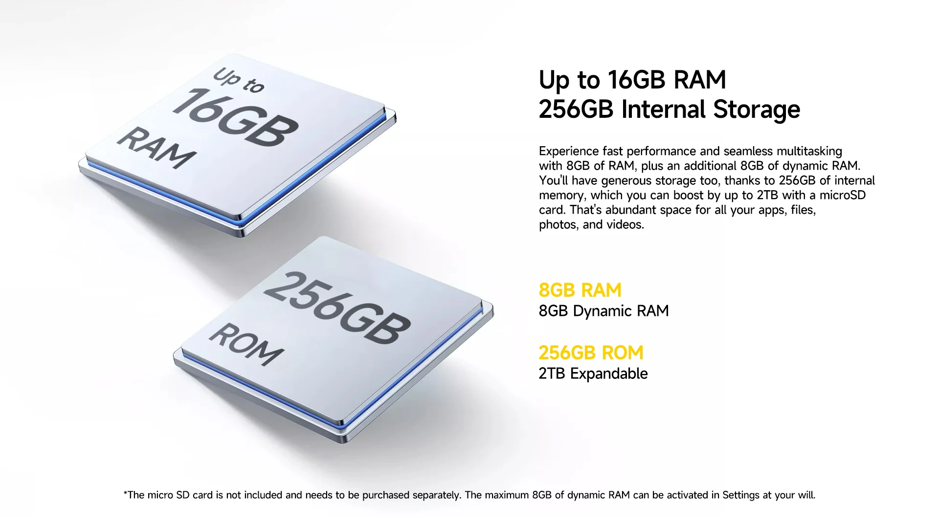 8 GB de RAM + 8 GB de expansión dinámica para una multitarea perfecta.Almacenamiento de 256 GB, ampliable hasta 2 TB.
