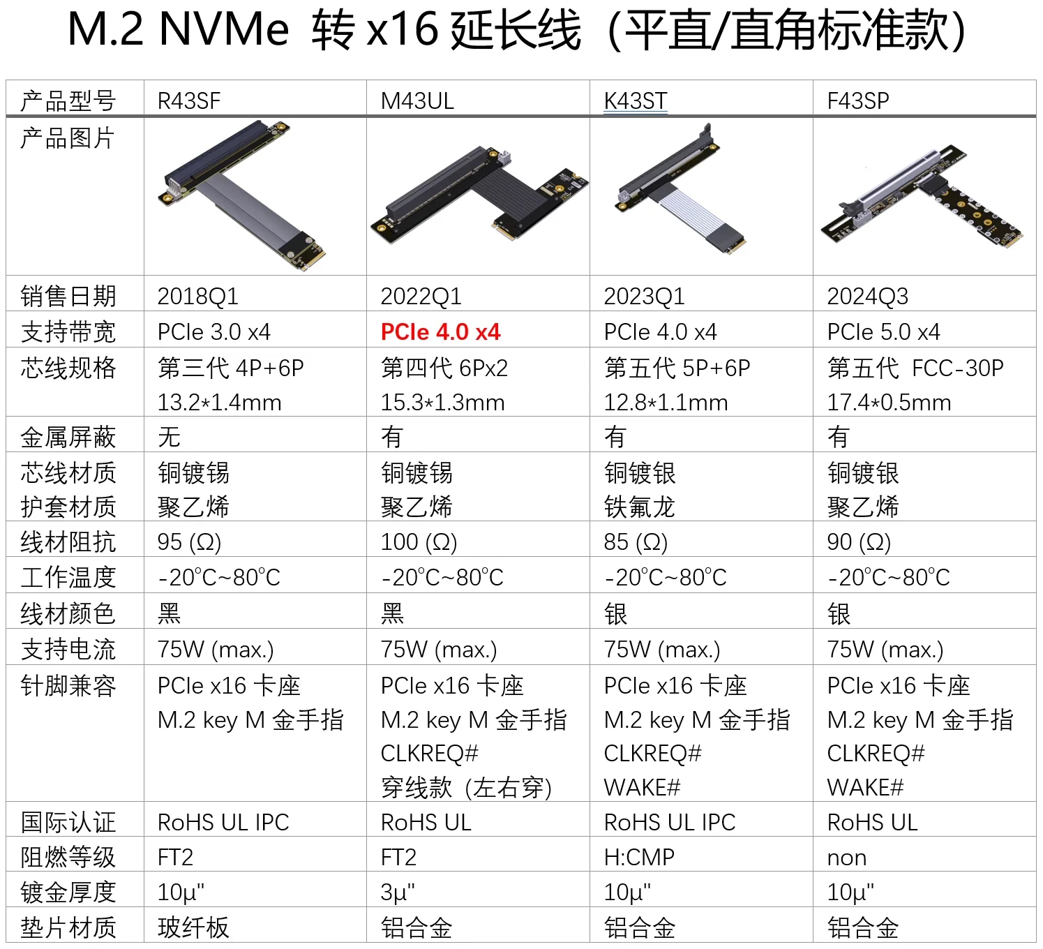 Modeloexplicarancho de bandaK43ESTOCable de extensión M.2 NVMe a X16, versión estándar, férula de 180 grados para asiento hembra, modelo rectoPCIe 4.0 x4K43SMCable de extensión M.2 NVMe a X16, versión estándar, asiento hembra modelo de ángulo recto con flexión hacia arriba de 90 gradosPCIe 4.0 x4K43SPCable de extensión M.2 NVMe a X16, versión estándar, modelo universal con curva superior de 90 grados del asiento hembraPCIe 4.0 x4K43SWCable de extensión M.2 NVMe a X16, versión estándar, 270 grados hacia abajo del asiento hembra, modelo en ángulo rectoPCIe 4.0 x4K43DTCable de extensión M.2 NVMe a x16, dedo dorado girado 180 grados, modelo plano de asiento hembra abiertoPCIe 4.0 x4K43DT-TUEl dedo dorado M.2 NVMe a x16 gira 180 grados hacia atrás, modelo plano de asiento femenino abiertoPCIe 4.0 x4K43DPEl dedo dorado de M.2 NVMe a x16 gira 180 grados y el asiento femenino se dobla 90 grados.Modelo universalPCIe 4.0 x4K43DP-TUEl dedo dorado de M.2 NVMe a x16 gira 180 grados al revés y el asiento femenino se dobla 90 grados.Modelo universalPCIe 4.0 x4K43DWM.2 NVMe a x16 Dedo dorado para girar 180 grados Asiento madre 270 grados hacia abajo doblar modelo en ángulo rectoPCIe 4.0 x4K43DW-TUEl dedo M.2 NVMe a x16 Gold gira 180 grados al revés, el asiento femenino se dobla 270 grados hacia abajo en ángulo rectoPCIe 4.0 x4K43UTCable de extensión M.2 NVMe a x16, doblado lateral del dedo doradoPCIe 4.0 x4K43UPescoliosis GoldfingerPCIe 4.0 x4K43UWCable de extensión M.2 NVMe a X16, doblado lateral con dedo dorado, asiento hembra, modelo de ángulo recto con curvatura hacia abajo de 270 gradosPCIe 4.0 x4Ventajas del producto: