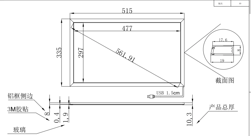 Pantalla multitáctil IR de 22 pulgadas con proporción 16:10 y 10 puntos Dibujo de dimensiones del producto: