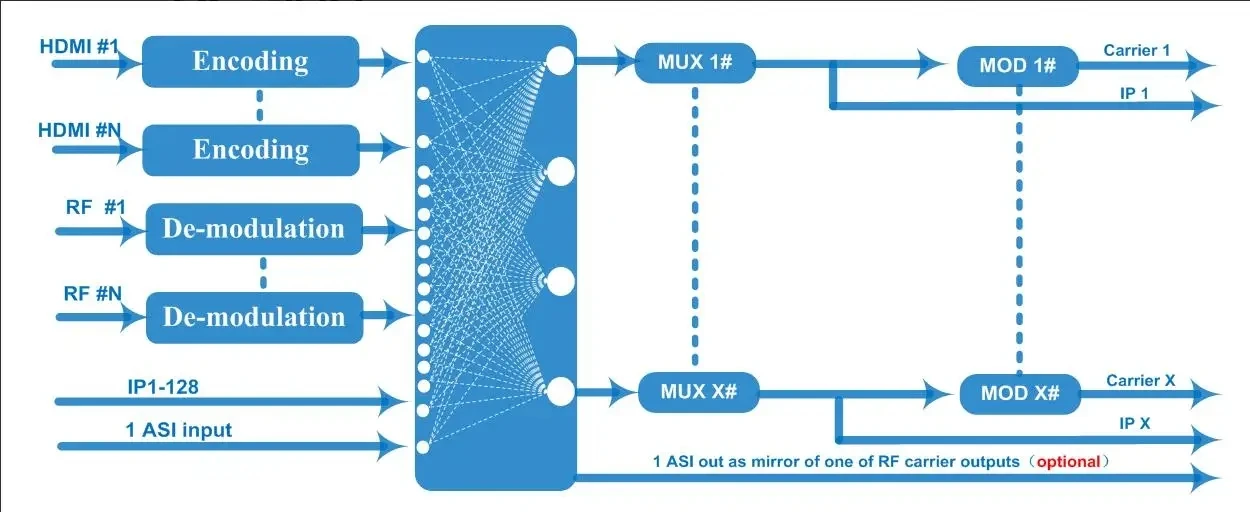 El modulador codificador de la serie EX2404X es un dispositivo rentable recientemente desarrollado con funciones de entrada HDMI/IP/ASI y modulación.El dispositivo admite 24 entradas HDMI, 1 entrada/salida IP Gigabit; Salidas portadoras 4/8/16 (ATSC, ISDBT, DTMBT, DVB-C/DVB-T) y salidas de 4/8 MPTS y salida SPTS de 24 canales.Un solo dispositivo integra un conjunto completo de funciones del sistema frontal, que presenta alta integración, alto rendimiento y bajo costo, lo cual es muy adecuado para sistemas de transmisión de TV digital en hoteles, clubes, hospitales, baños, etc.