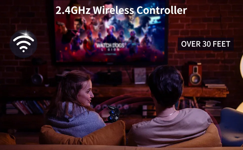 La tecnología de transmisión inalámbrica 2,4G (con receptor USB) garantiza una conexión estable sin demora, y ofrece un alcance de hasta 10 metros (30 pies), haciendo posible disfrutar jugando desde el otro lado de la habitación