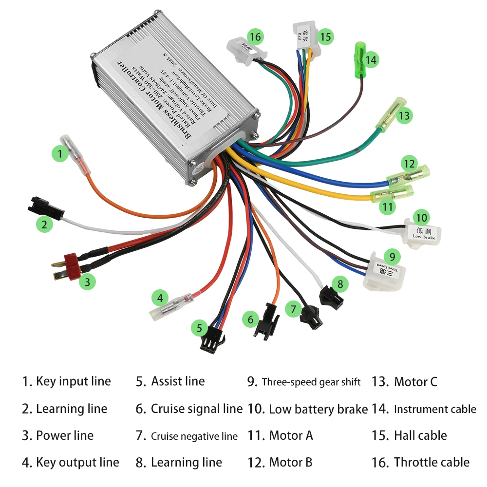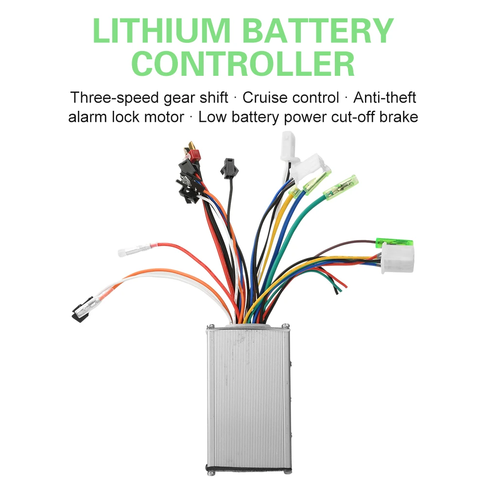 Features: Three-speed shifting, handlebar-mounted plug, key switch plug, high-battery brake, low-voltage brake, cruise control, analog gauge, forward/reverse selection via learning wire