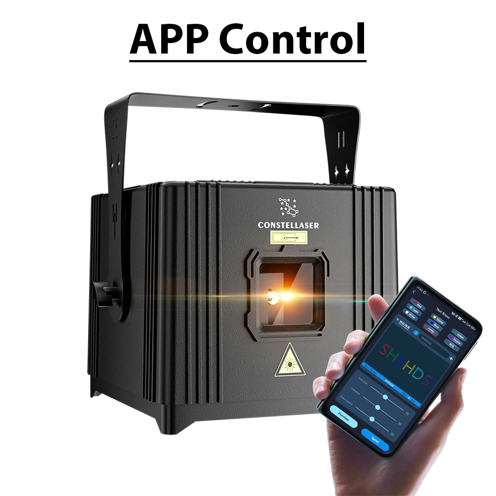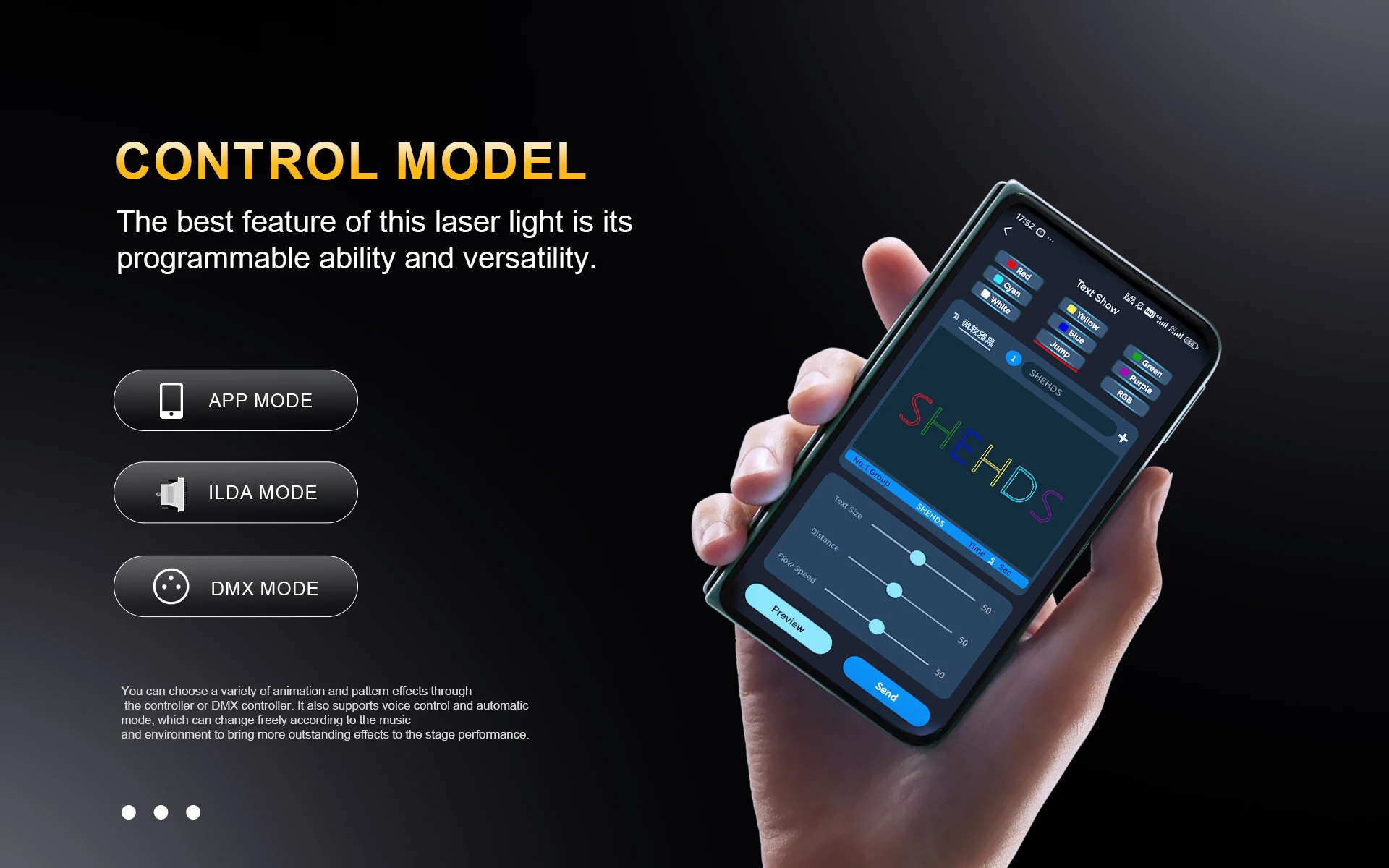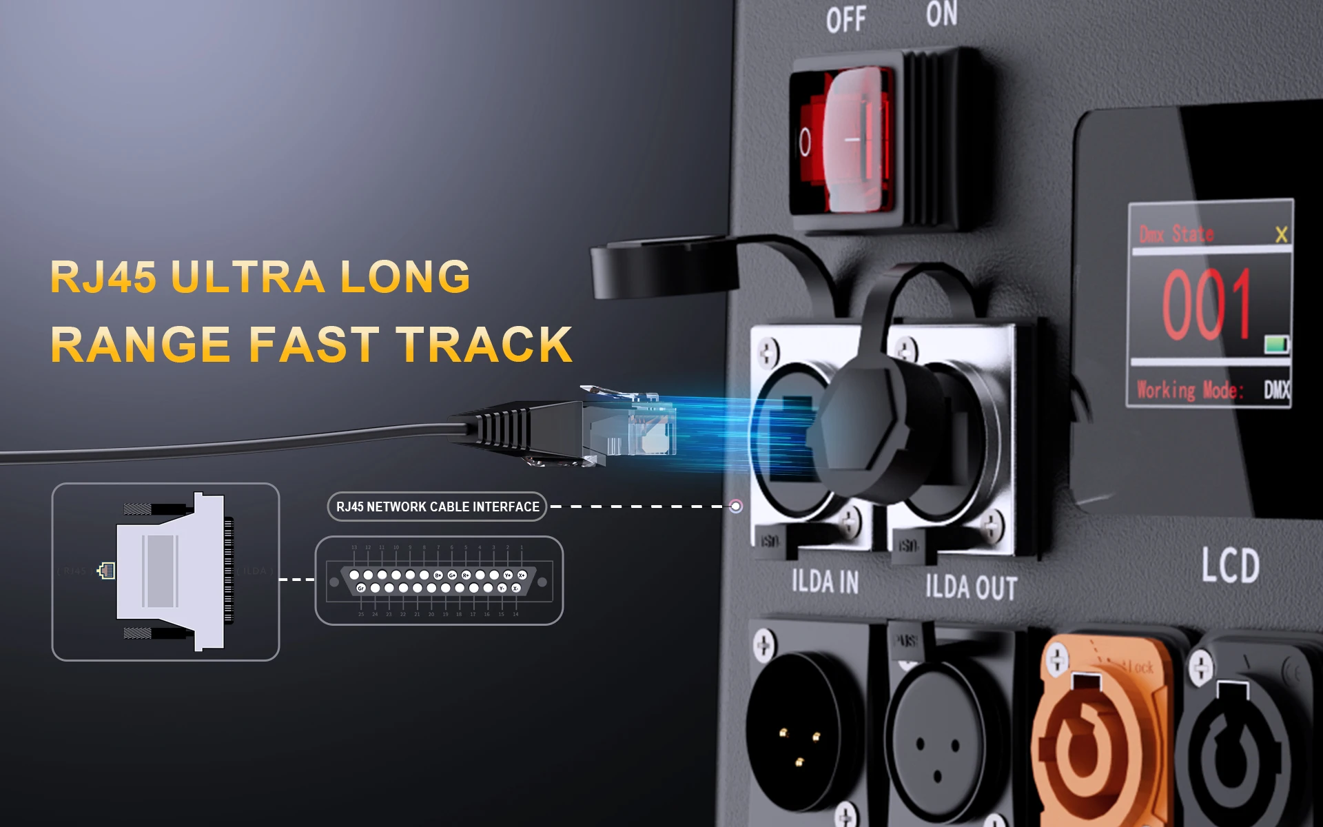 Admite protocolo de señal DMX512, ILDA a RJ45 y control de aplicaciones móviles;