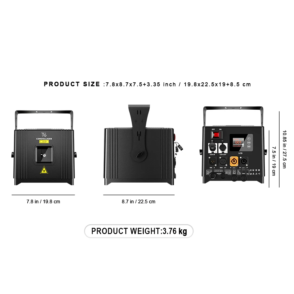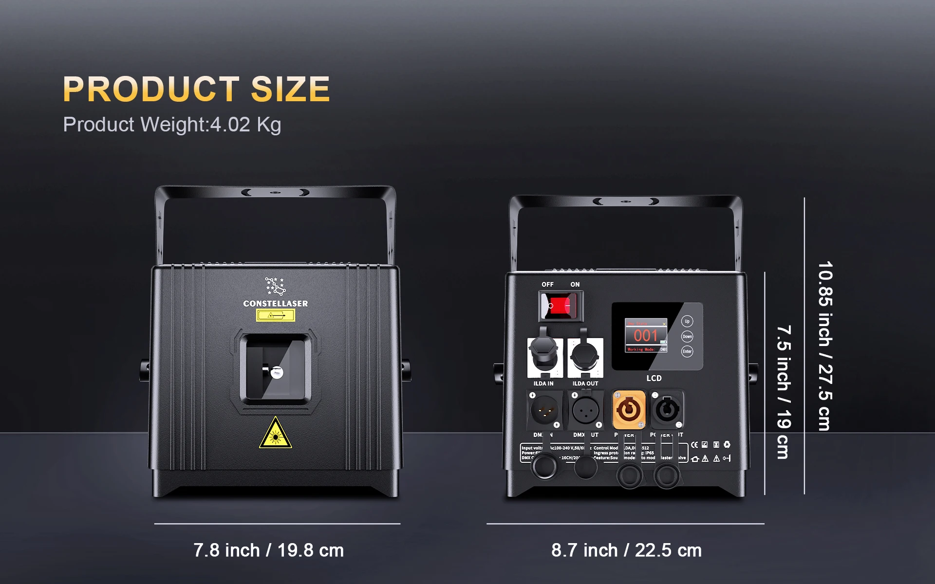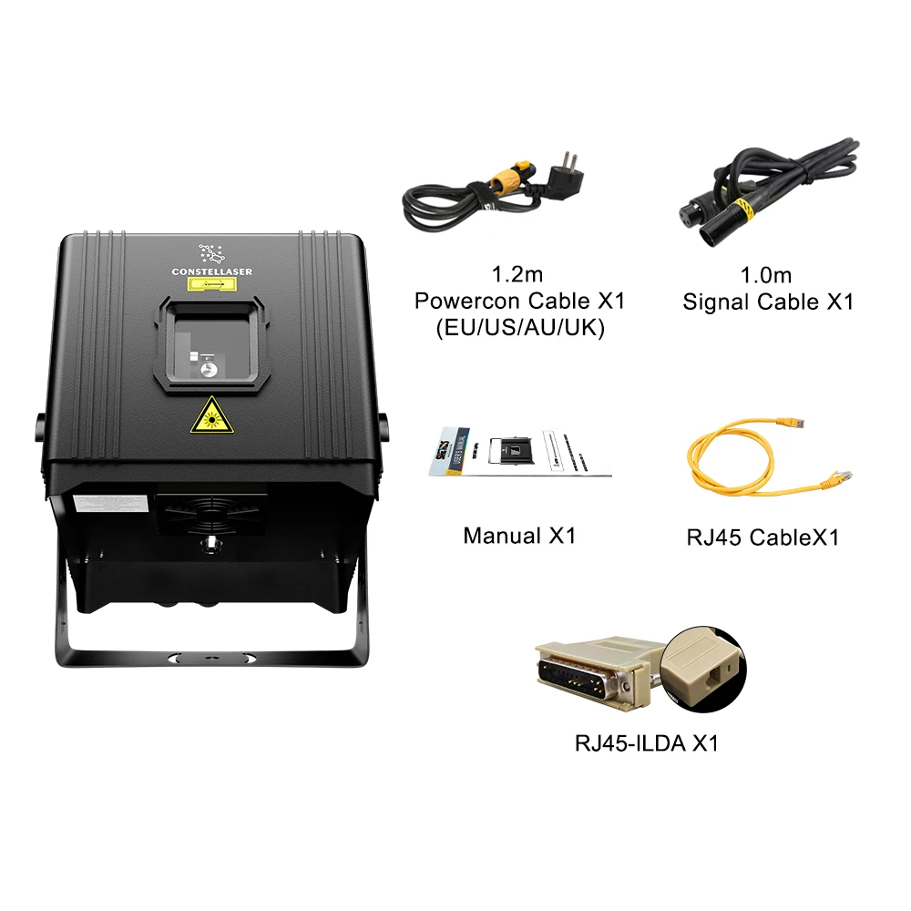 Admite protocolo de señal DMX512, ILDA a RJ45 y control de aplicaciones móviles;