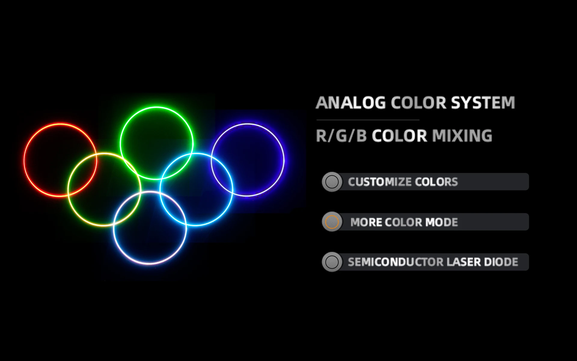 Puede producir siete colores degradados (rojo, verde, azul, morado, amarillo, azul claro y blanco).