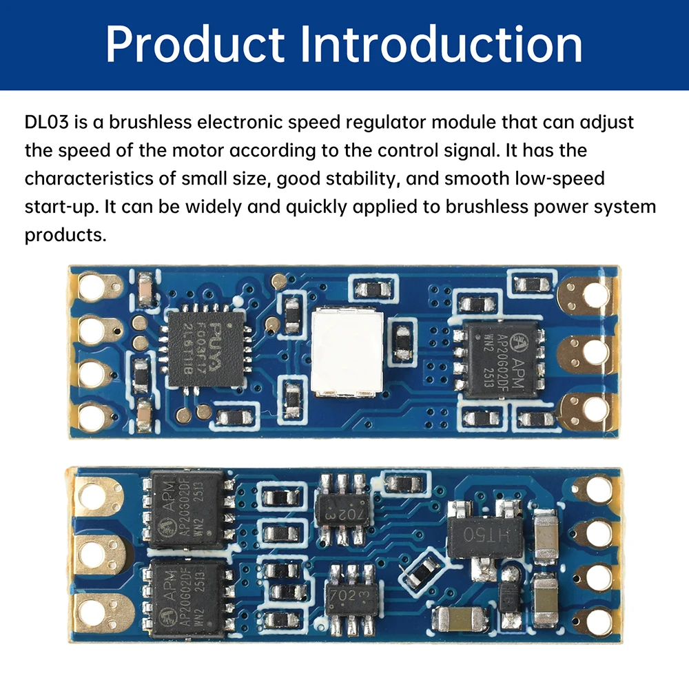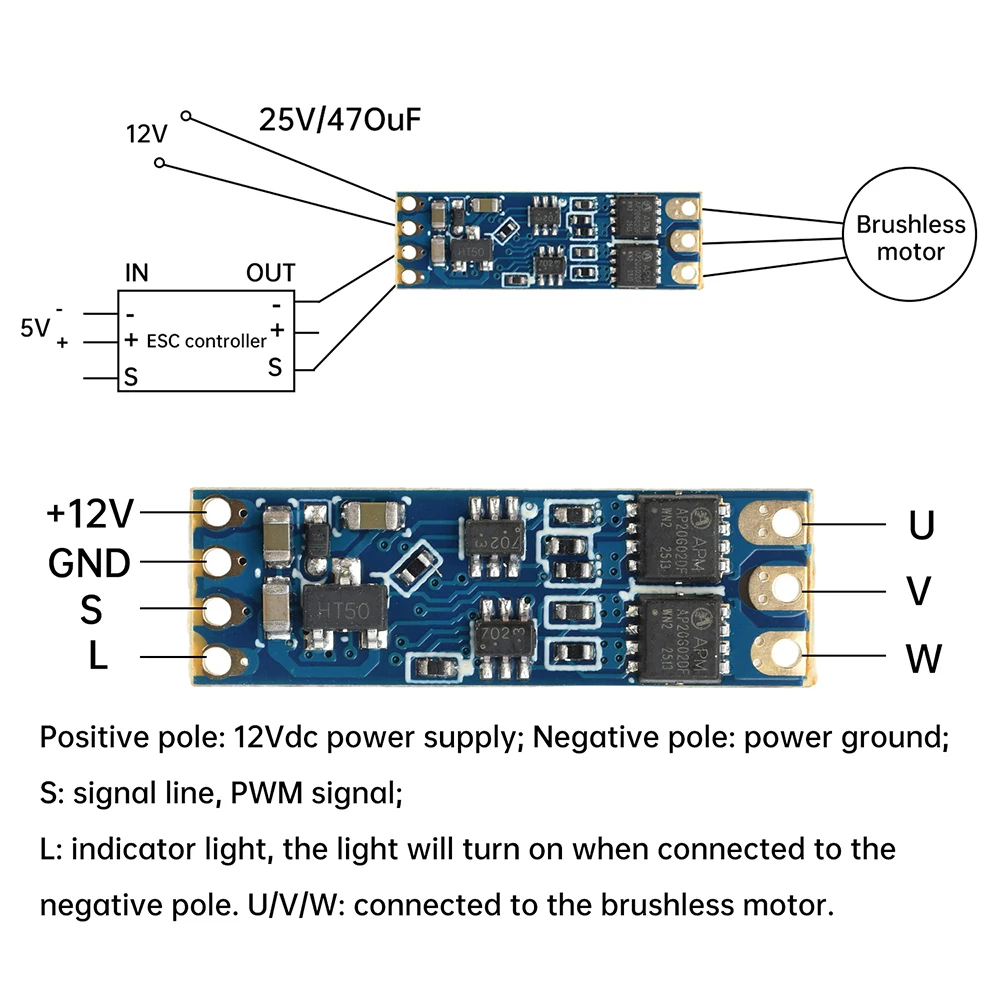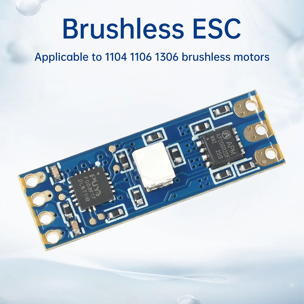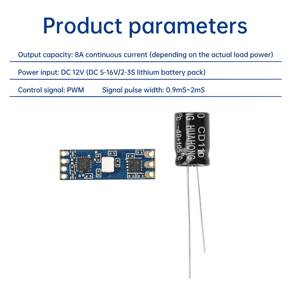 1.Admite baterías 2S-3S, amplio rango de voltaje, adecuado para una variedad de modelos de aviones2.Alta estabilidad de funcionamiento, asegurando un funcionamiento eficiente y continuo del motor.3.Admite una regulación precisa de la velocidad, ajusta de manera flexible la velocidad del motor de acuerdo con la señal de control4.Volumen mini y liviano, ahorra espacio, adecuado para una variedad de modelos de microaviones5.Arranque suave a baja velocidad, reduce el impacto inicial y prolonga la vida útil del equipo.Parámetros del producto:Capacidad de salida: corriente continua 8A (dependiendo de la potencia de carga real)Entrada de energía: CC 12 V (paquete de baterías de litio CC 5-16 V/2-3 S)Señal de control: PWMAncho del pulso de señal: 0,9 mS ~ 2 mSPrecauciones:1.¡Asegúrese de revisar cuidadosamente los polos positivo y negativo antes de realizar el cableado!¡Se recomienda encarecidamente conectar condensadores y diodos en paralelo entre los polos positivo y negativo para proteger otros componentes del ESC!2.El ESC es propenso a sobrecalentarse cuando se sobrecarga, y el motor ralentizará o se detendrá, ¡o incluso se quemará!3.¡El condensador debe conectarse cuando se utiliza 2S!Asegúrese de agregar disipación de calor cuando lo use, ¡especialmente después de 2A ~ 3A!El ESC solo tiene un pin de entrada de señal y una salida de voltaje de fuente de alimentación de 5 V sin BEC.Es impulsado por la señal PWM estándar de un receptor de modelo de avión común y puede ser impulsado por un probador ESC.El ESC es adecuado para motores pequeños sin escobillas como 1104, 1106 o 1306.Debe probarse y comprender en uso real.4.Algunos jugadores instalaron directamente el ESC, pero escucharon un pitido y el motor no gira o no se pudo aumentar la velocidad.Las posibles razones son las siguientes:a.Asegúrese de que el motor y la potencia del ESC coincidanb.Los tres cables del ESC sin escobillas se pueden conectar arbitrariamente.Si la dirección es incorrecta, se pueden intercambiar dos cables cualesquieraC. Color general del cable: rojo positivo, negro negativo, línea de señal amarillaLista de embalajeESC sin escobillas * 1