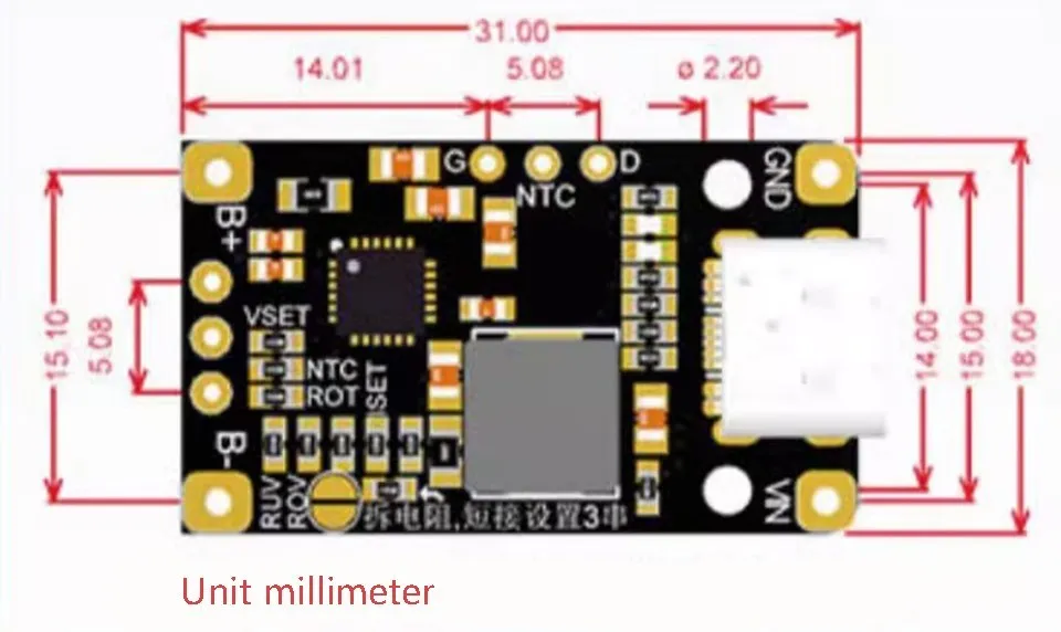 El módulo es adecuado para dos o tres cuerdas de baterías de litio de 3,7 V, a través de la configuración de cortocircuito, el valor predeterminado es de 2 cuerdas, cuando se utilizan dos cuerdas, se puede utilizar la función de equilibrio de la batería del módulo, esto es muy práctico, Ingrese el puerto tipo-c disponible y el cable de soldadura, el puerto tipo-c está conectado a la fuente de carga rápida, ajusta automáticamente el voltaje de carga, mejora la eficiencia, si la entrada del cable de soldadura, el voltaje de entrada debe ser menor que el voltaje de la batería, y el módulo solo puede funcionar en el estado de impulso.