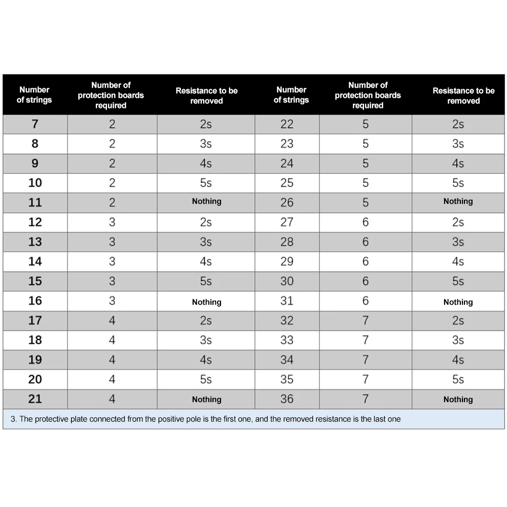 Esta placa de protección se puede conectar en serie para adaptarse a más paquetes de baterías.No existe un límite superior para la cantidad de baterías multichip conectadas en serie.El diagrama de cableado se muestra en la siguiente figura.Se deben conectar dos cadenas adyacentes superpuestas para transmitir el voltaje.El cálculo de la placa protectora necesaria para más de 6 cadenas de paquetes de baterías se muestra en la tabla adjunta.