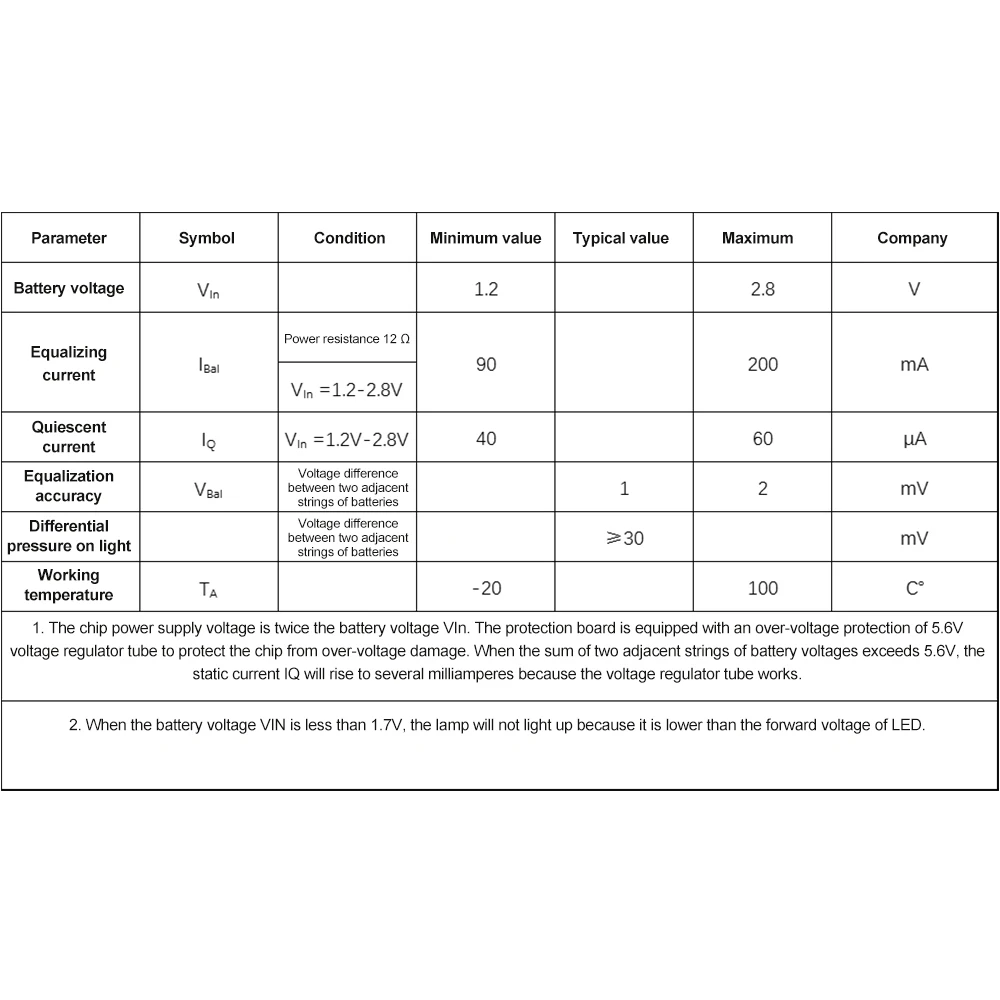 1.El voltaje de la fuente de alimentación del chip es el doble que el voltaje de la batería VIn.La placa de protección está equipada con una protección contra sobretensión del tubo regulador de voltaje de 5,6 V para proteger el chip contra daños por sobretensión.Cuando la suma de dos cadenas adyacentes de voltajes de la batería supera los 5,6 V, el coeficiente intelectual de corriente estática subirá a varios miliamperios porque el tubo regulador de voltaje funciona.