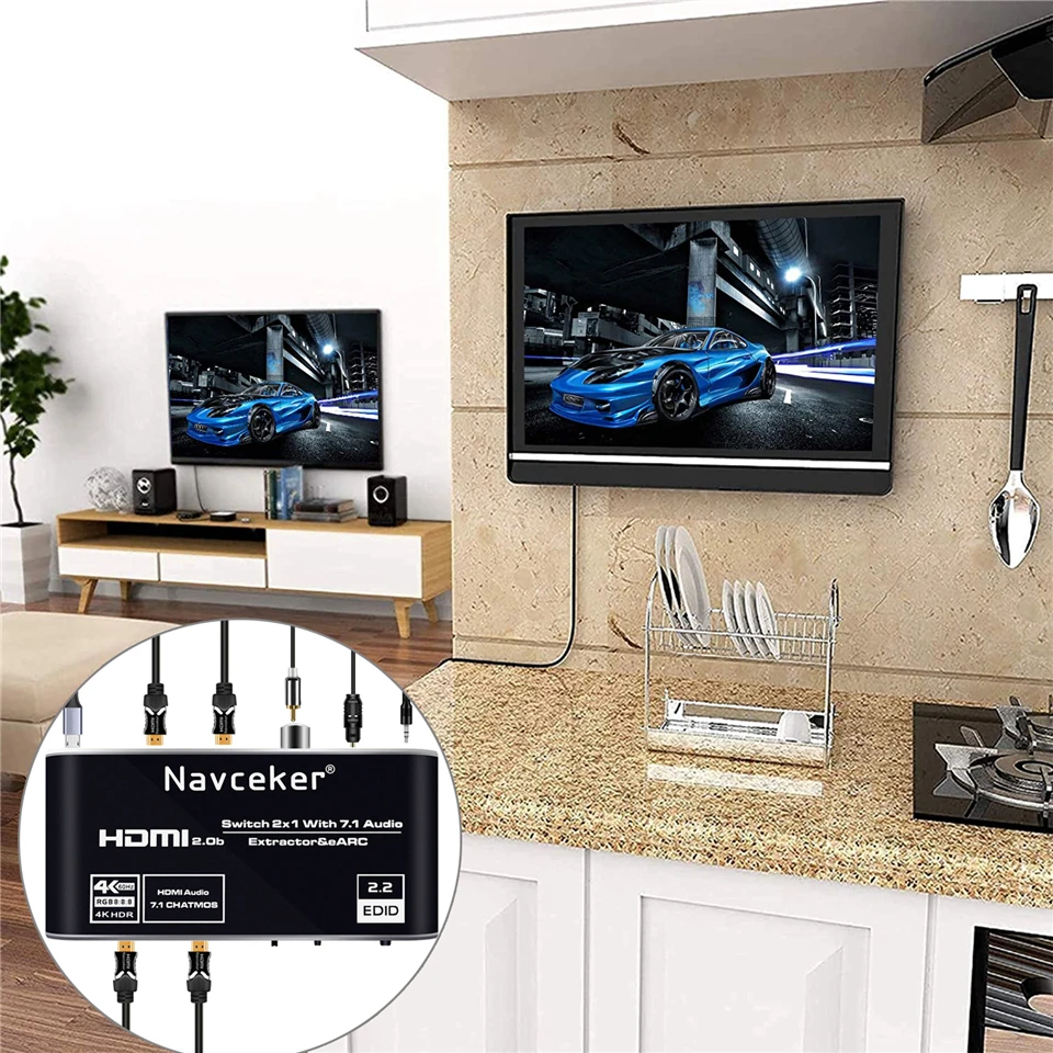 Navceker 2x1 4K 120Hz HDMI 2,0 Switch eARC Audio Extractor es un interruptor de alto rendimiento de 2 entradas HDMI y 1 salida HDMI con salida de audio. Salida de audio HDMI /Toslink/3,5mm Jack compatible con la función de extracción de audio, AUDIO SOLAMENTE HDMI /Toslink /Coaxial compatible con ARC (canal de retorno de Audio),AUDIO SOLACE HDMI compatible con eARC (canal de retorno de Audio mejorado). El sistema admite todos los formatos de TV 3D, además de todos los formatos HDTV hasta 4K x 2K @ 60Hz/120Hz RGB 8 :8 :8.