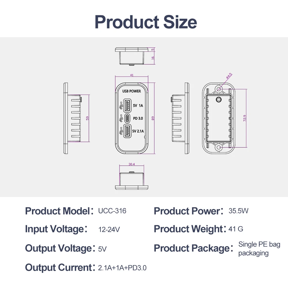 4.Simply installation It's surface mount installation. The device can be installed on a flat surface, with no need to cut a large hole, just a small hole to put the wire in, easy to be installed within 20 minutes. Universally suitable for most 12V/24V Vehicles, Cars, Motorcycles, Boats, RV. Input: 12V-24V,2.1A+1A+PD3.0