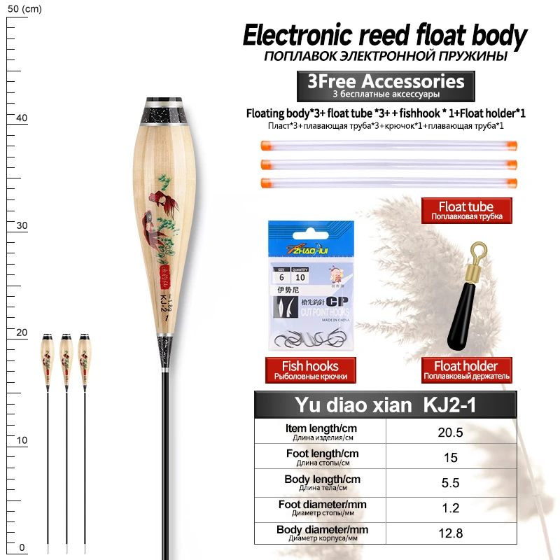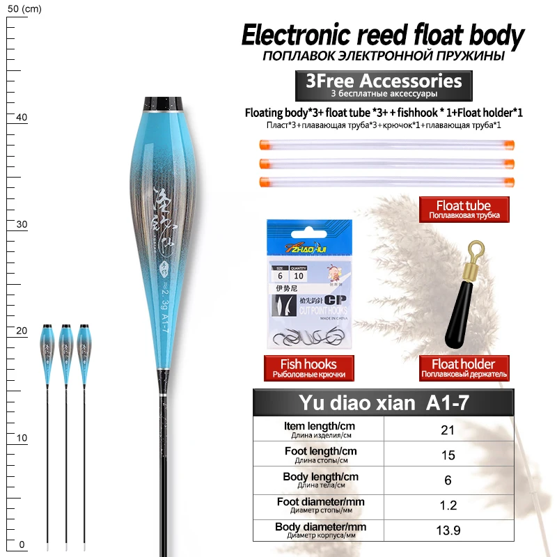 Cuerpos flotantes de 3 piezas + tubos flotantes de 3 piezas + 1 soporte flotador + 1 bolsa de anzuelos de pesca