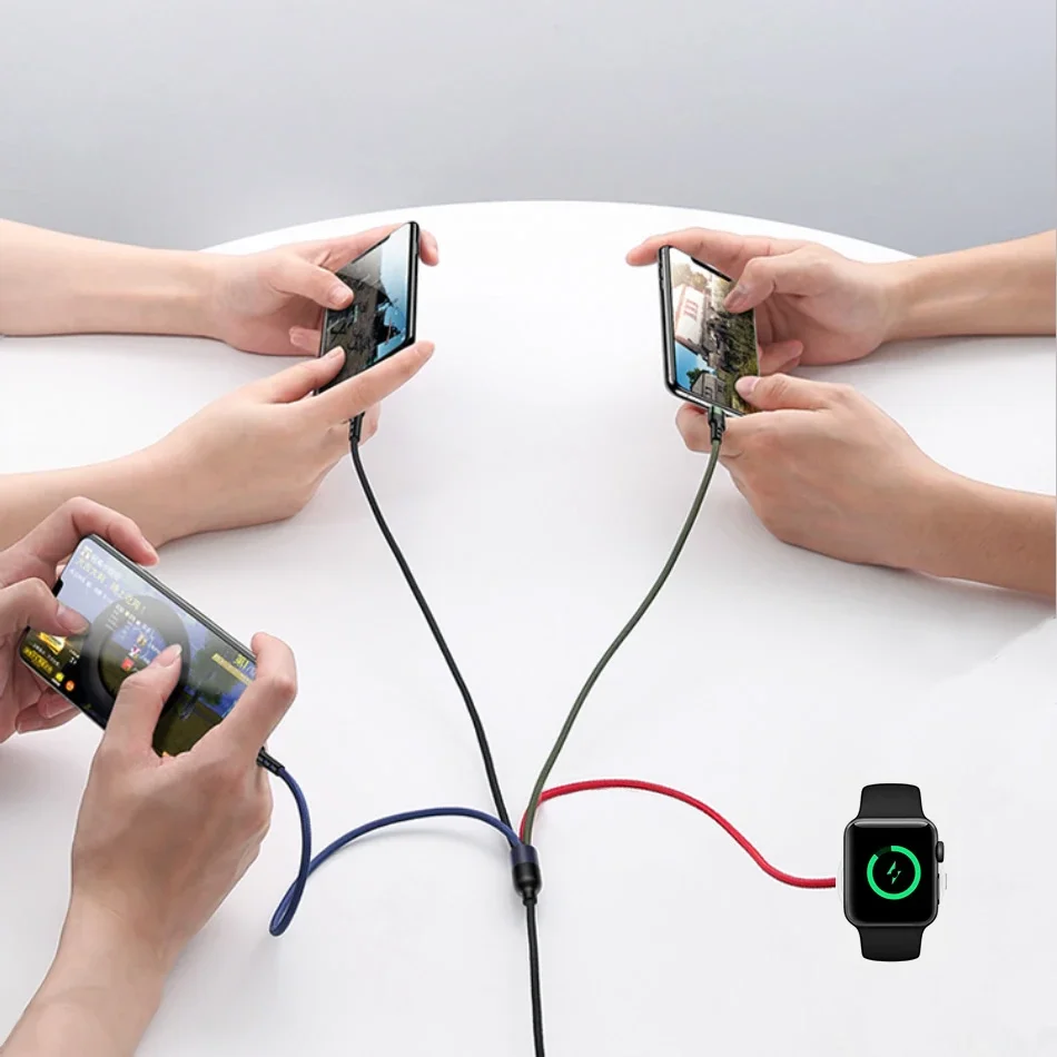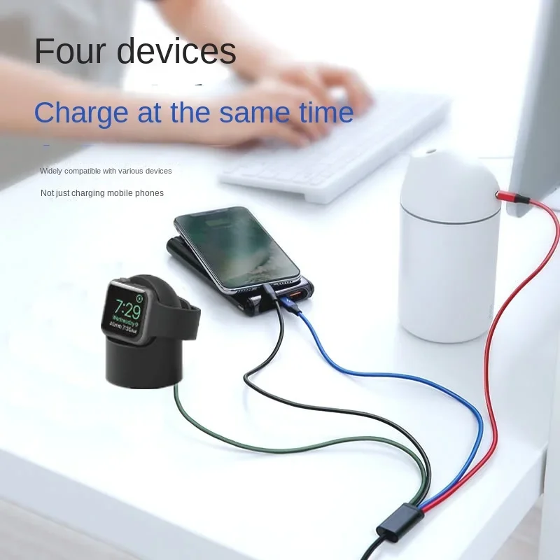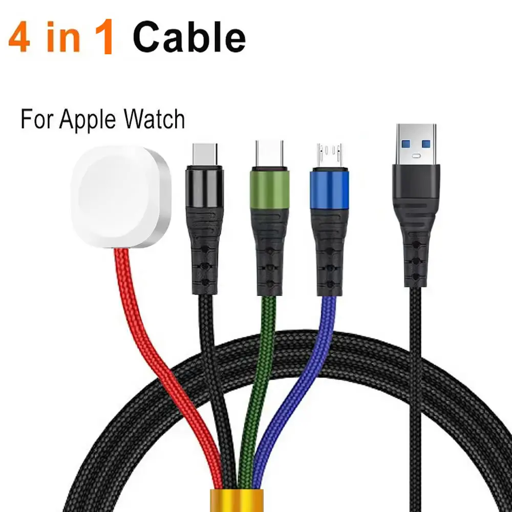 CABLE DE CARGA 4 en 1 PARA RELOJES Y TELÉFONOS: El cable de carga 4 en 1 está diseñado para series de relojes A-pple, teléfonos móviles y dispositivos electrónicos.¡No utilices 4 cables diferentes cuando todo lo que necesitas sea uno!¡Tenemos muchas opciones y estilos que se adaptan a cualquier dispositivo que tengas!Tenemos un cable de carga de reloj 4 en 1, iP de 8 pines, Micro USB y Type-C. Puede admitir la carga de 4 dispositivos al mismo tiempo.