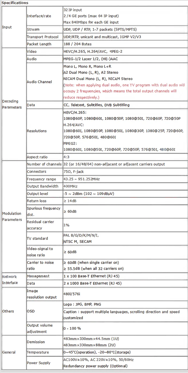 * Maneja la multidifusión IP de hasta 32 Gigabit Ethernet MPEG TS en hasta 32 programas estándar PAL/DK/BG /NTSC/TV