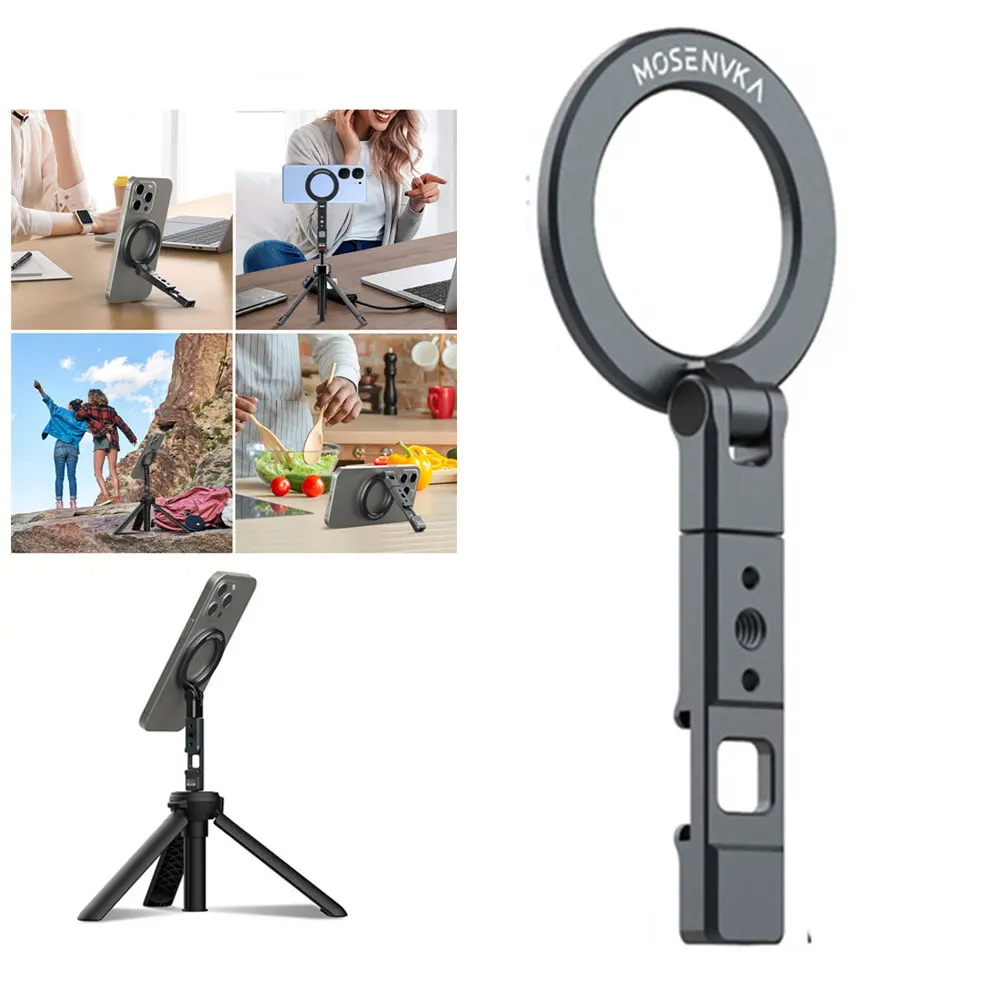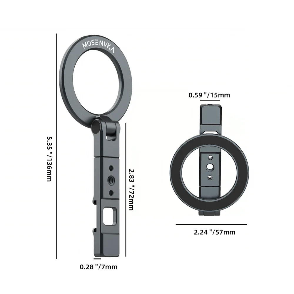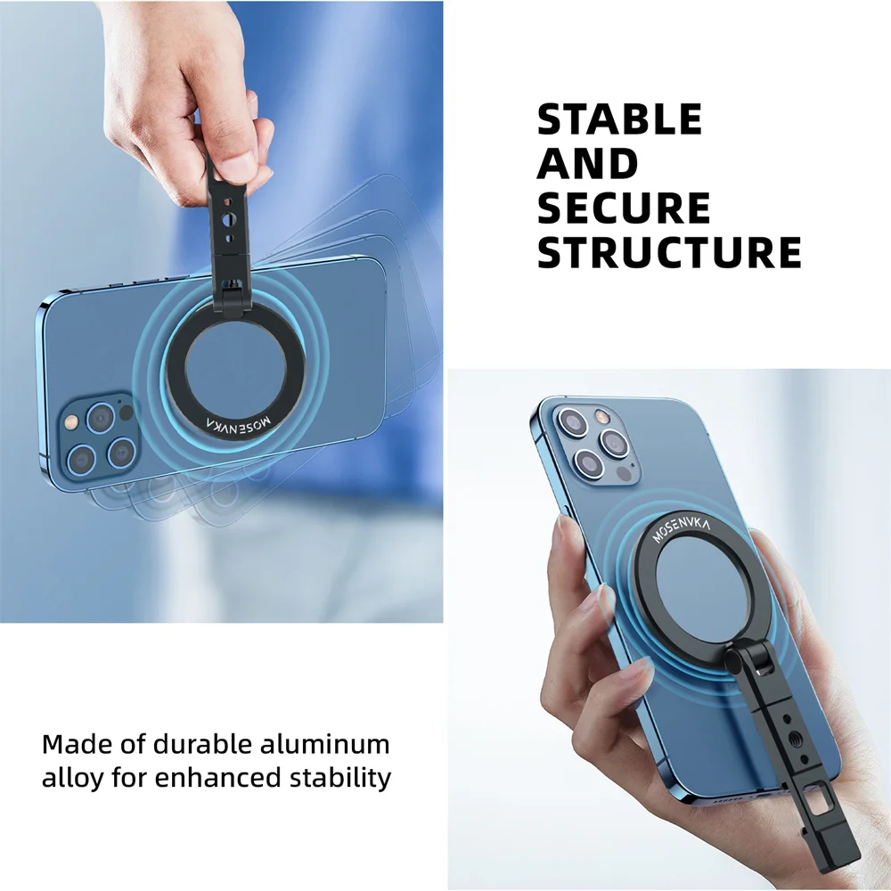 Lleve su grabación de video al siguiente nivel con este audaz soporte magnético para teléfono, diseñado para iPhone compatibles con Magsafe de la serie 12 a 16.Fabricado con aluminio resistente, cuenta con un versátil soporte para trípode de 1/4''-20 y una zapata fría para agregar potentes accesorios.Bloquee su teléfono en su lugar con un fuerte agarre magnético y dé rienda suelta a su creatividad sin límites.Este es el equipo que se atreve a mantenerse al día con tus aventuras de filmación más locas.
