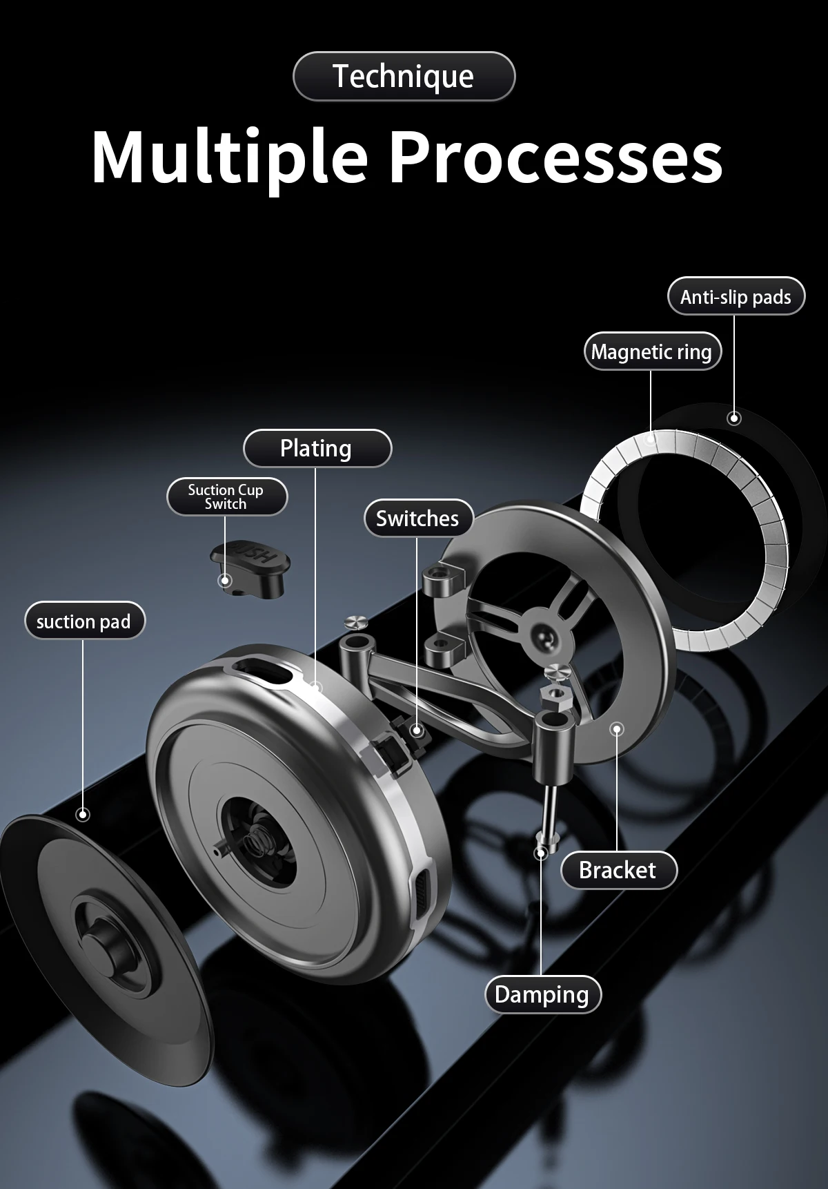 • Si no hay material a base de hierro, pegue el anillo de metal sobre una superficie sin hierro para crear una base.Luego, coloque la parte posterior de su teléfono sobre la ventosa de goma y presione suavemente, el motor interno comenzará a funcionar para crear un vacío.(El teléfono no debe tener una funda, o si es así, la parte posterior de la funda de plástico debe ser plana y lisa)