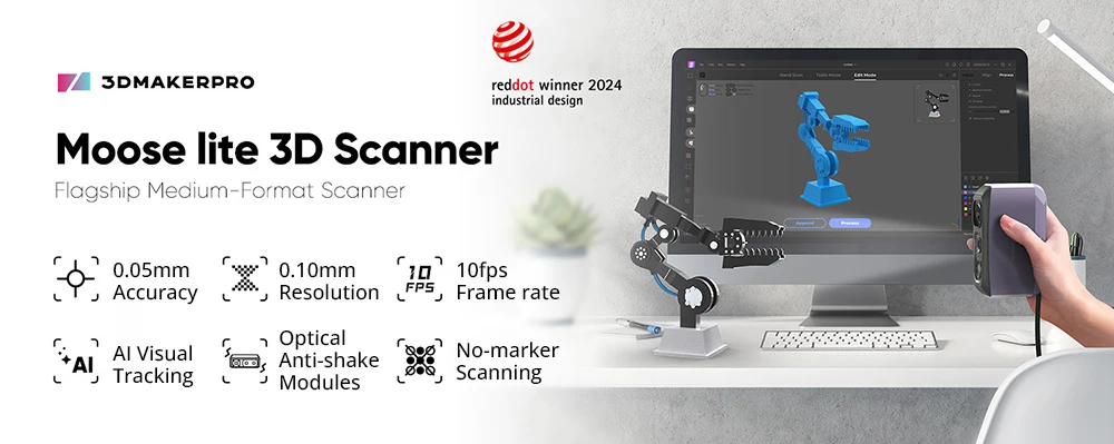 El escáner 3D portátil Moose Lite es más que un escáner de alta precisión, es una solución más inteligente para escanear. Con el poder del seguimiento avanzado de IA y un innovador algoritmo de nube de puntos, el escáner de impresora 3D Moose Lite hace que sea más fácil obtener modelos 3D perfectos.