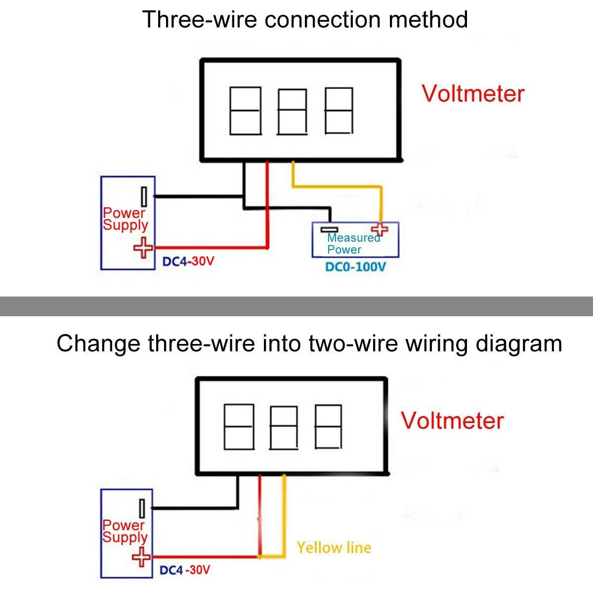 • 2 métodos de conexión: 3 cables se conectan por separado para medir el voltaje y la potencia (el amarillo rojo es ambos anterior, el negro es negativo); 3 cables se utilizan como 2 cables, conectados para medir el voltaje y el amarillo se puede emparejar, el negro esneg).