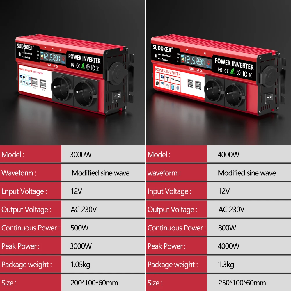 Comprar 4000W 3000W inversor de potencia DC 12V a CA 220V 230V Transformador con 4 USB EU Socket Charge con pantalla LED para coche de teléfono RV