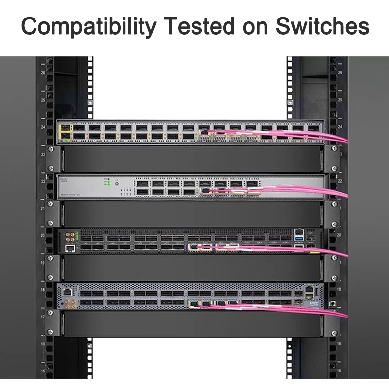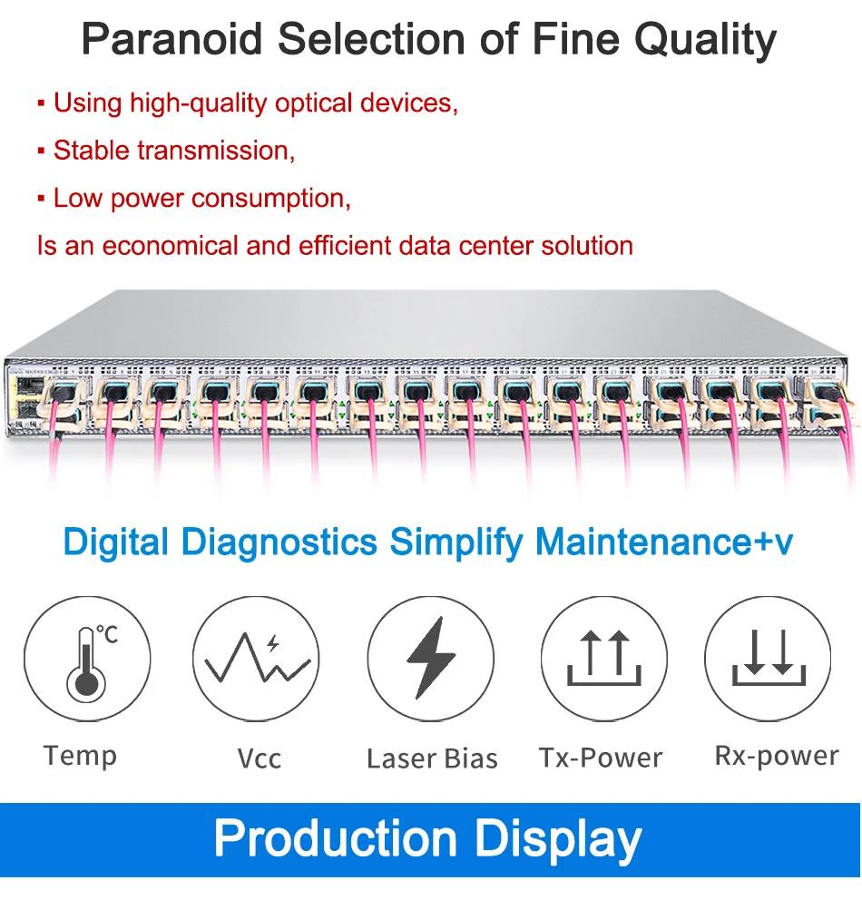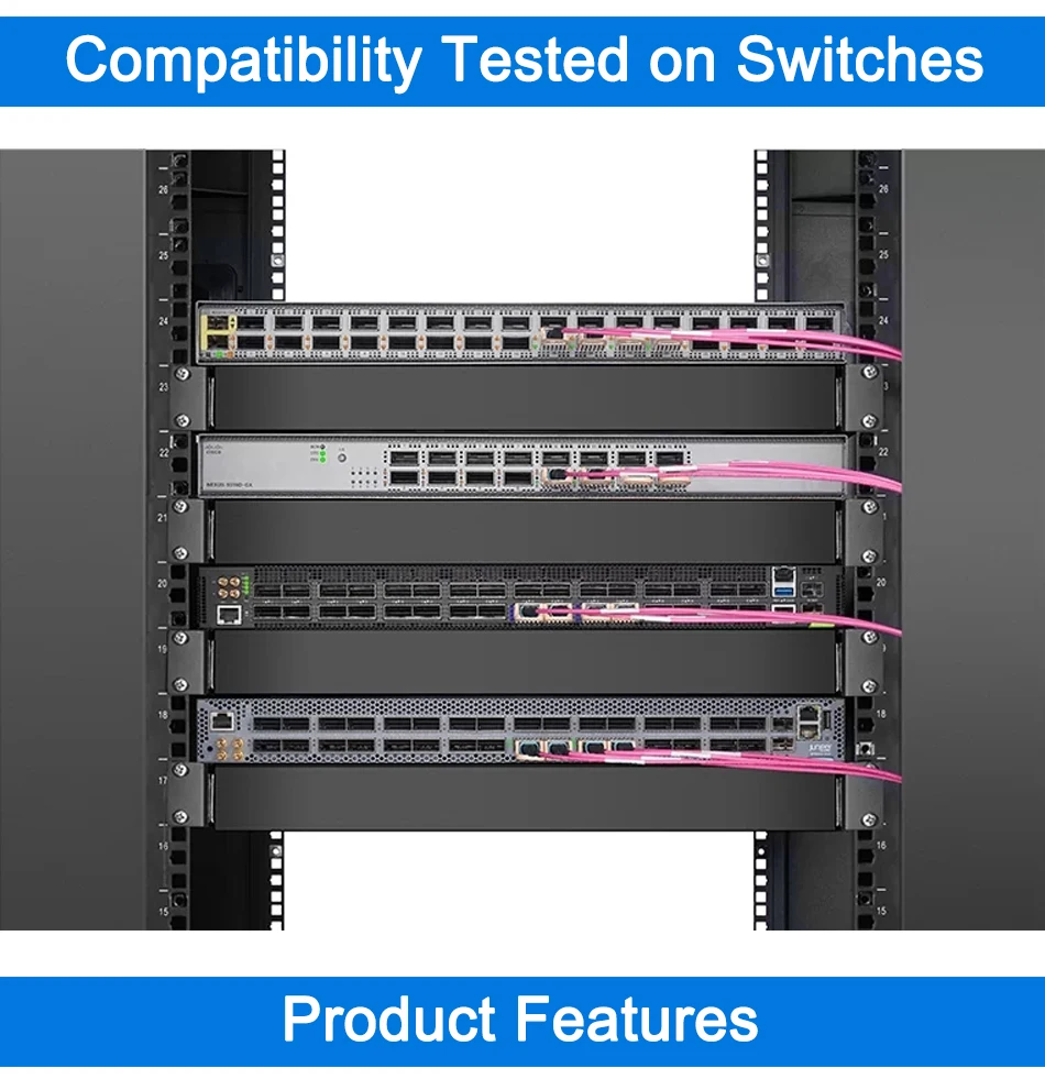 El módulo 400GBASE-SR8Admite longitudes de enlace de hasta 100m sobre fibra multimodo (MMF) con conector MTP/MPO-16. Cumple con el protocolo IEEE 802.3bs y el estándar 400GAUI-8/CEI-56G-VSR-PAM4. La señal Gigabit Ethernet de 400 grados se transmite a lo largo de ocho longitudes de onda. La multiplexación y desmultiplexación de las ocho longitudes de onda se gestionan dentro del dispositivo.