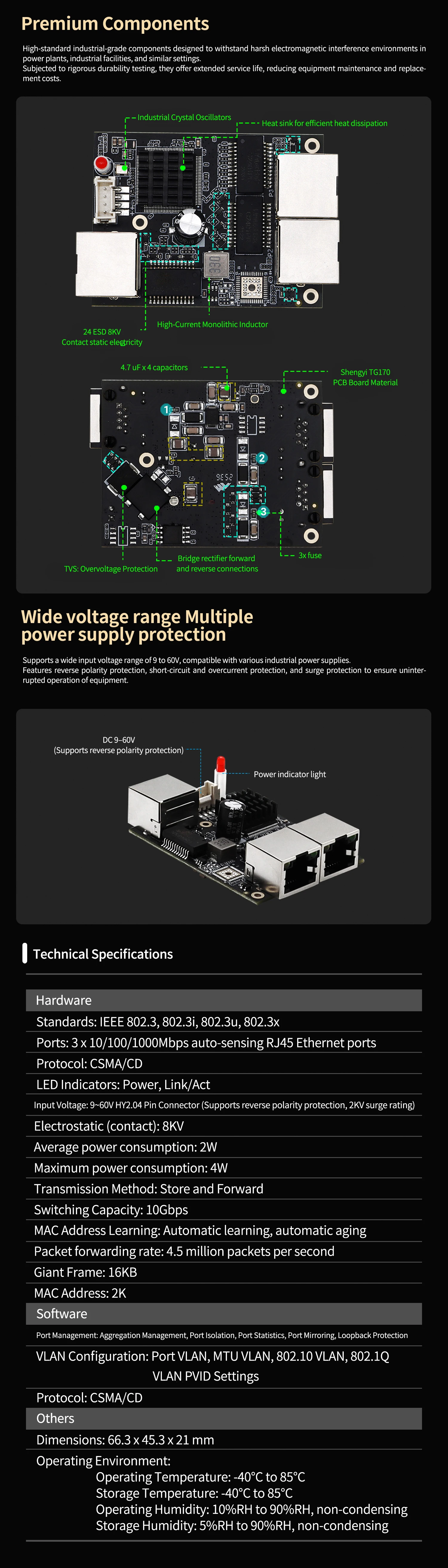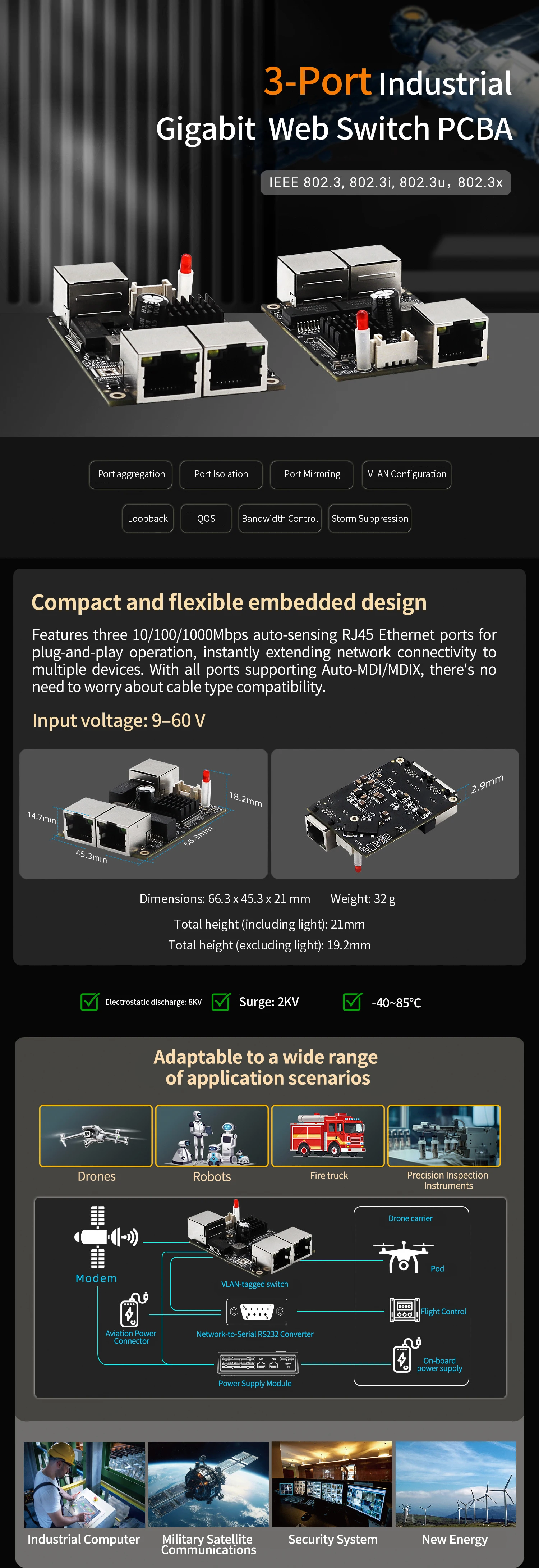 -40~85 ℃ Módulo de interruptor Gigabit de puerto RJ45 completo Industrial de 3 puertos, gestión de luz, interruptor VLAN, placa base PCBA