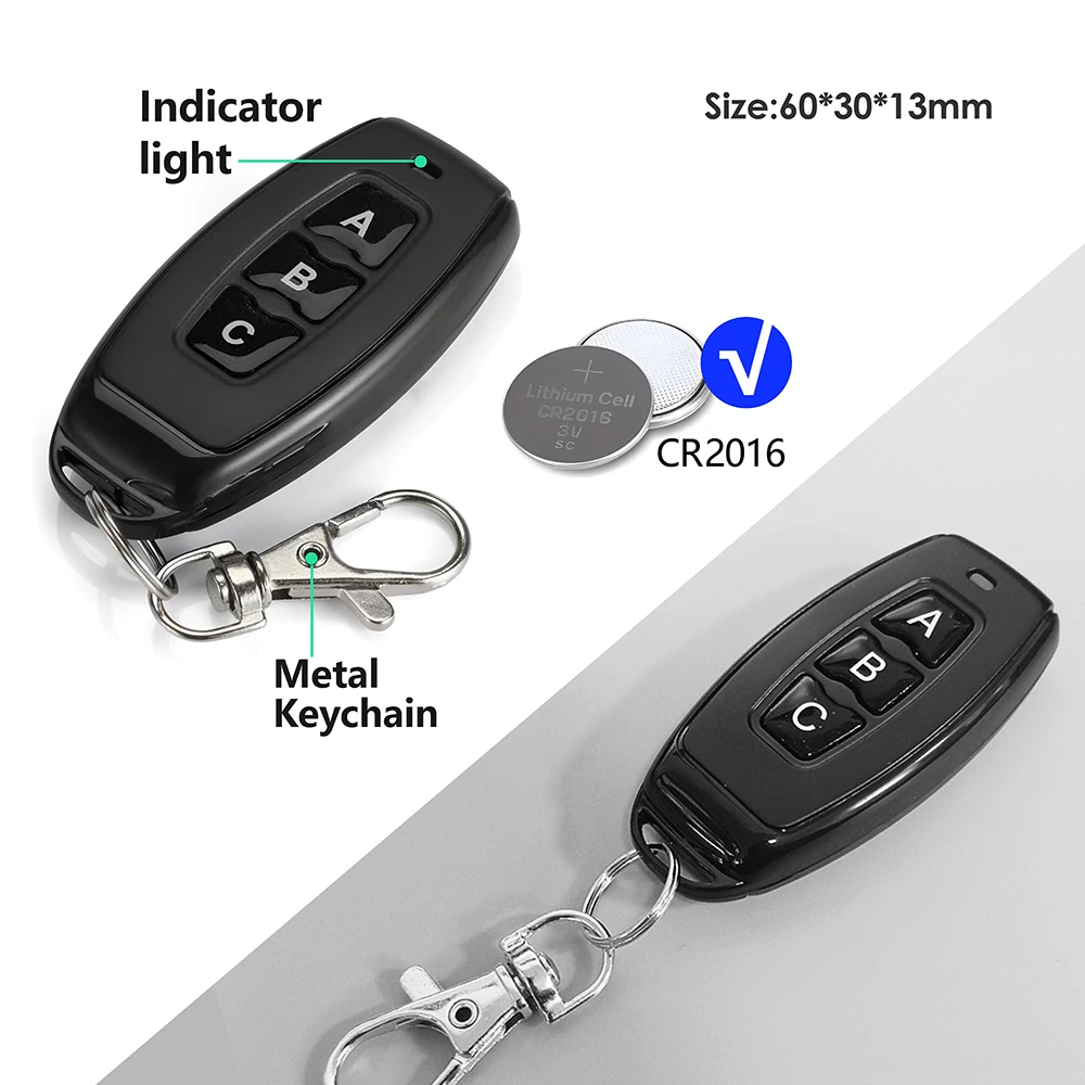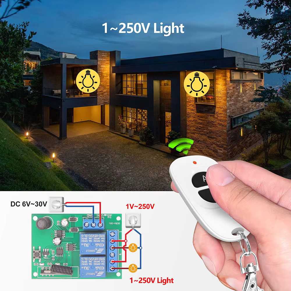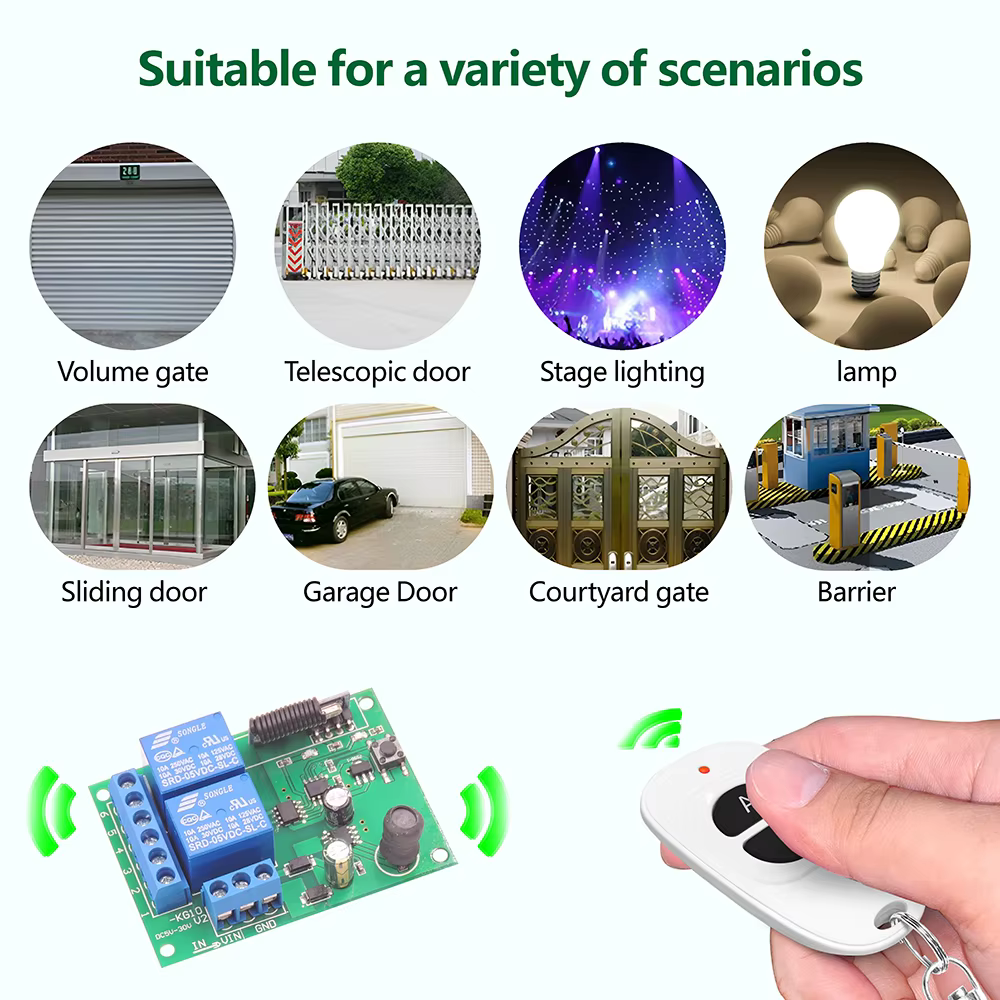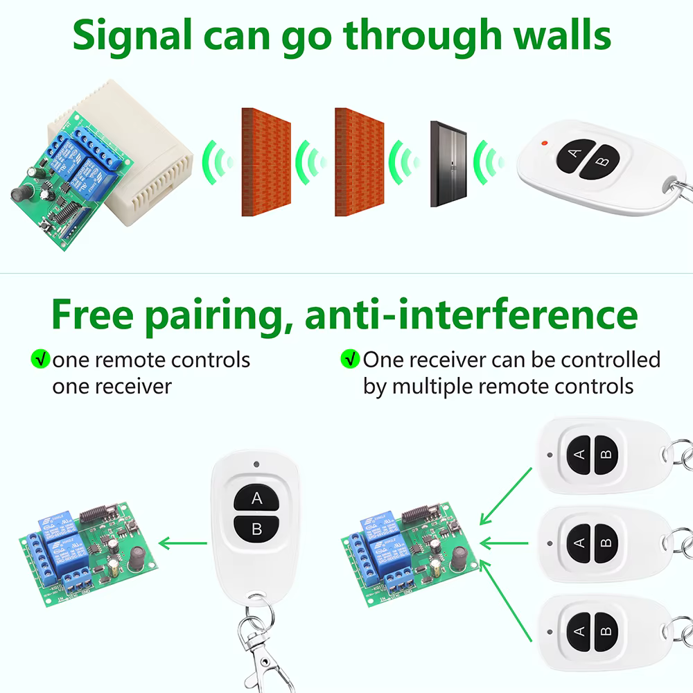 La señal es estable y puede atravesar paredes, y el emparejamiento es flexible.La distancia del mando a distancia puede alcanzar los 50 metros (en un área abierta).Un receptor se puede emparejar con hasta 25 controles remotos.